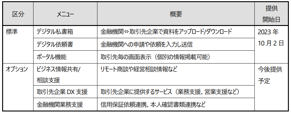 本サービスは、地域金融機関と取引先企業が安全かつ簡便にデータを授受できる「デジタル私書箱」、「デジタル依頼書」およびそのサービス基盤(会員管理、認証、セキュリティおよびポータル)を標準機能として提供します。さらに今後、相談支援など取引先企業と地域金融機関をつなぐ業務を効率化し、効果を高める各種サービスメニューを追加し、両者のDX(デジタルトランスフォーメーション)を支援していきます。