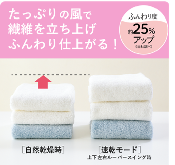 最大約12㎥/minの大風量と、幅約260cm※3の広範囲の送風により、洗濯物の両端までしっかり風を当てて乾きムラを抑えます。多方向からたっぷりと風を当てて繊維を立ち上げるので、タオル乾燥の“ふんわり”度が約25%アップ※4します。