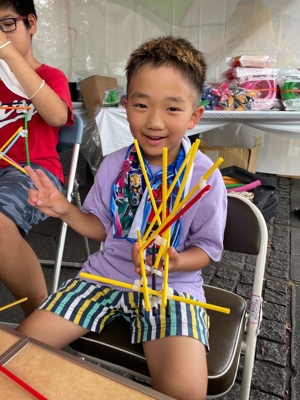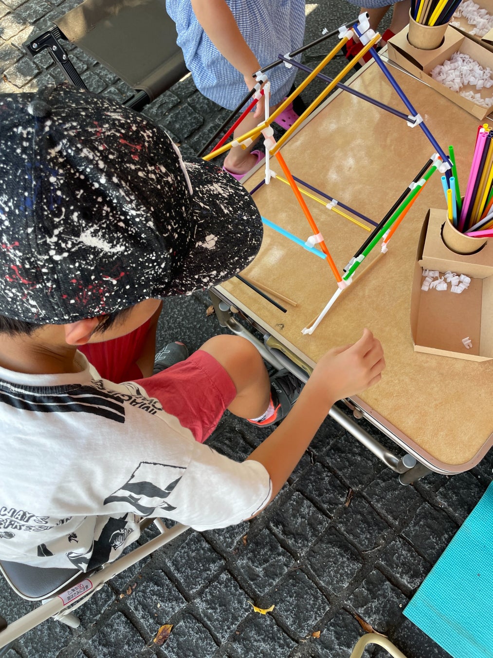 先日、実施したアシボのワークショップ、シンプルな2つのパーツだけですがストローに、ジョイントをはめるとだけを伝えるとその後は、夢中で思い思いの作品を作り始めてくれました。