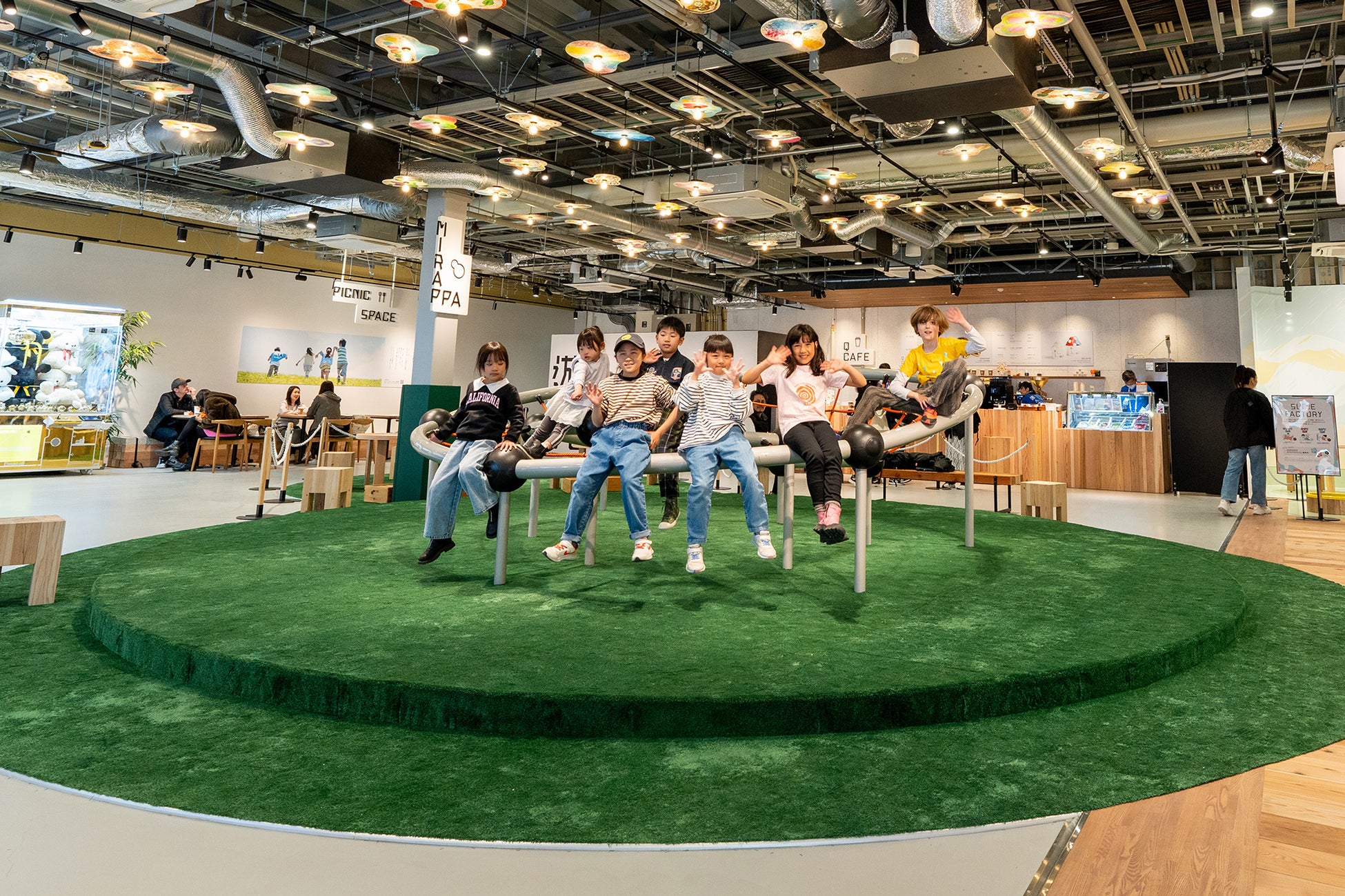 未来の公園をイメージしたスペース。中央には、木の上にいるような不思議な浮遊感が楽しめる遊具を設置。ぐるぐると動き回ったり、くつろいだり、遊び方自由自在の遊具です。