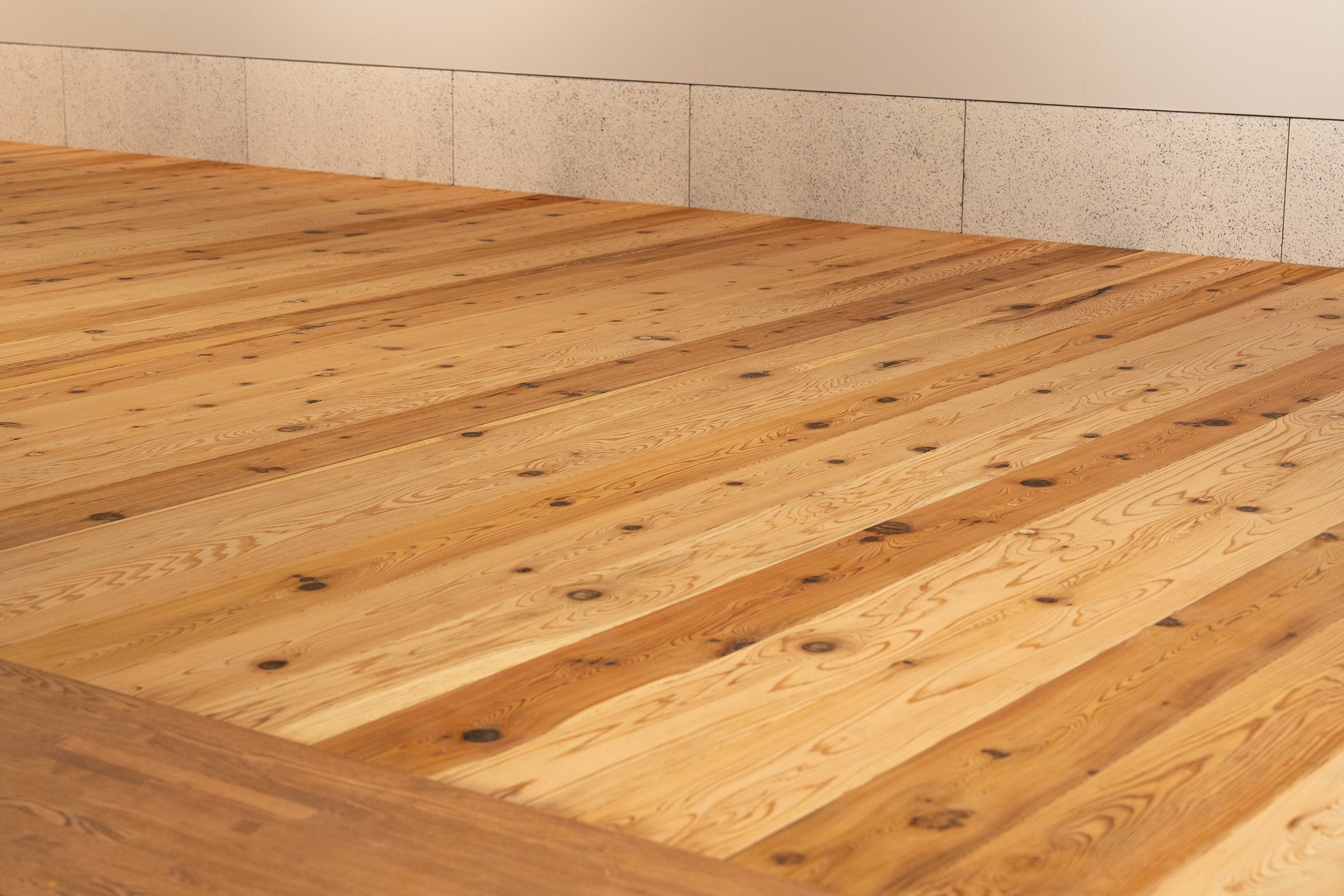 ワイドレジャーの倉庫に長年保管されていた九州産の銘木をカウンターやベンチ、フローリングに使用。万博終了後は、ワイドレジャーの運営する店舗で利活用します。