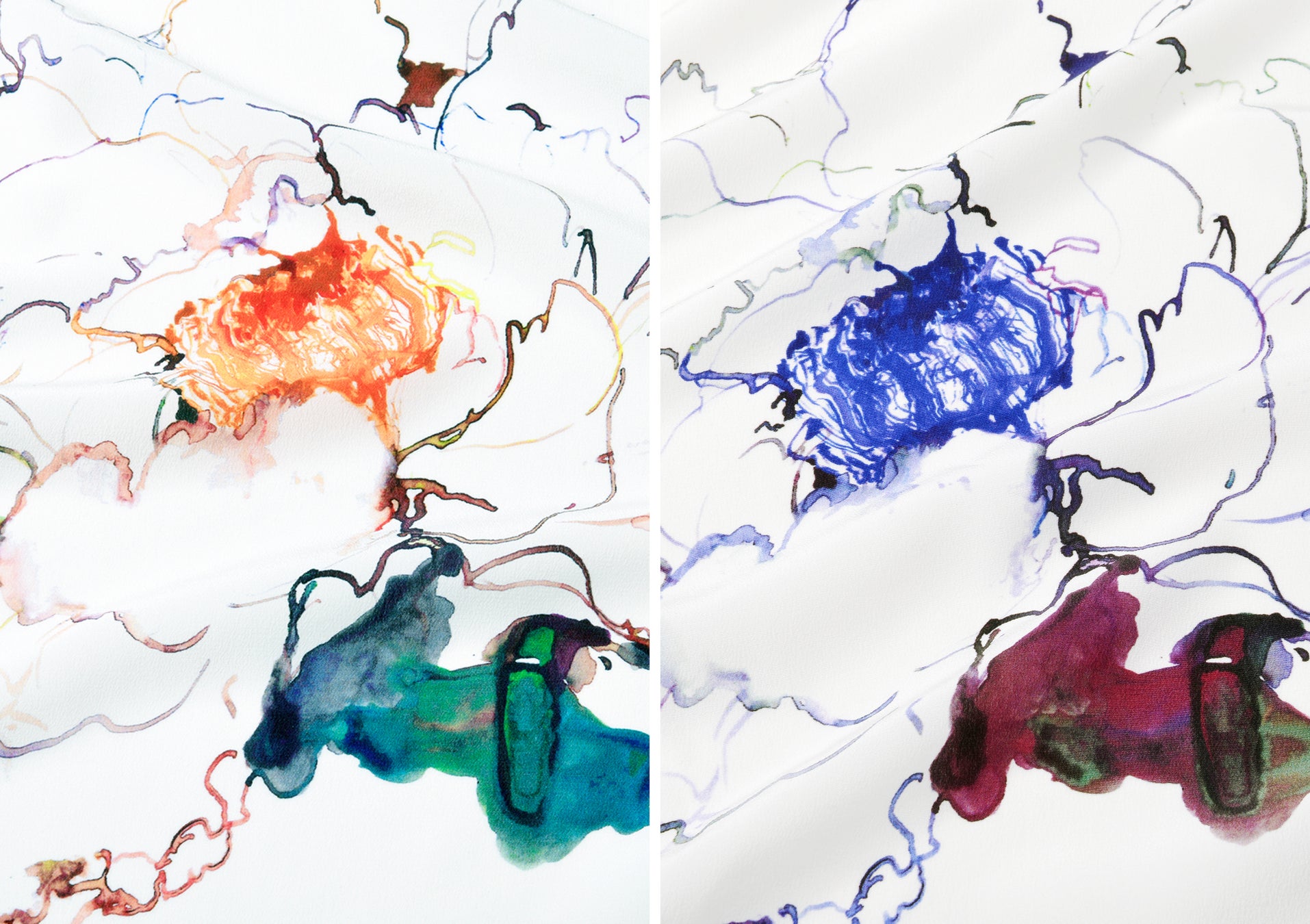 着物と同じ手描き友禅・刺繍などを用いたハイエンドなラインの「KIMONO GOWN Ultimate」と、千總のアーカイブや自然からのインスピレーションを受けて描かれたデザインが特徴の「KIMONO