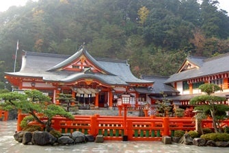 初詣には四国や九州からの参拝者があり、三が日で約25万人もの人が訪れます。約1000本の朱塗りの鳥居が、つづら折りの参道にずらりと並び真っ赤な鳥居のトンネルを10分ほど登ると朱塗りの社殿に到着します。境内からは津和野の町が一望できます。