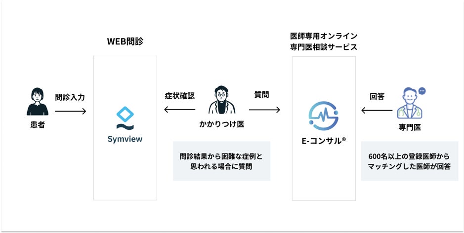 そこで、かかりつけ医が症状や既往歴などの患者情報を深堀りして収集するWEB問診『Symview』と、医師専用オンライン専門医相談サービス『E-コンサル®』が連携することで、かかりつけ医がいつでも専門医に相談できる仕組みを構築し、地域によらない「かかりつけ医機能の強化」を加速させることを目指します。