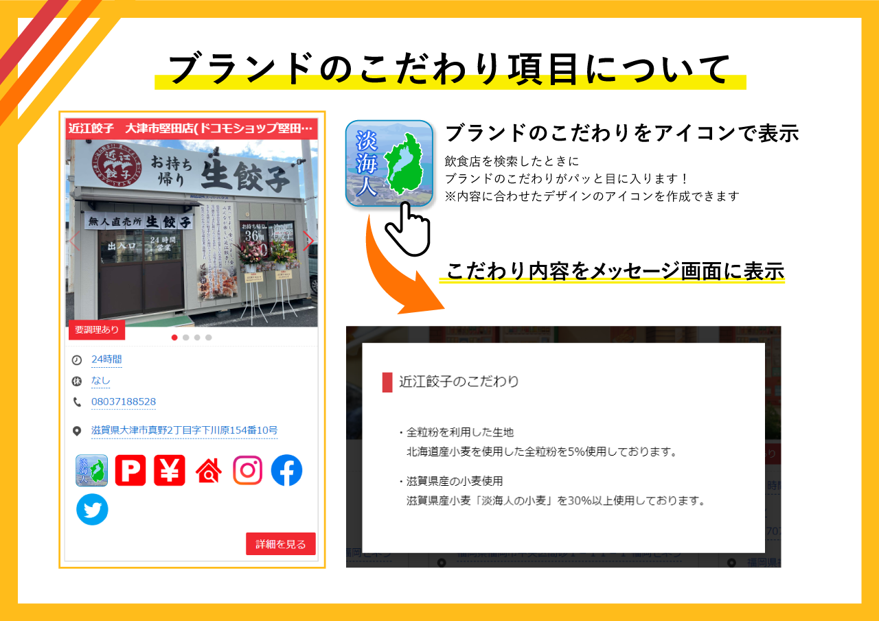店舗のPR項目やSNSリンクのアイコンの並びの先頭に、ブランドのこだわりをアイコンで表示することができます。このアイコンは通常のポータルでも表示されるので、ブランド専用ポータルを知らないお客様にもPR頂けます。またブランド専用ポータルでは、「こだわり検索」で絞り込むことも可能です。