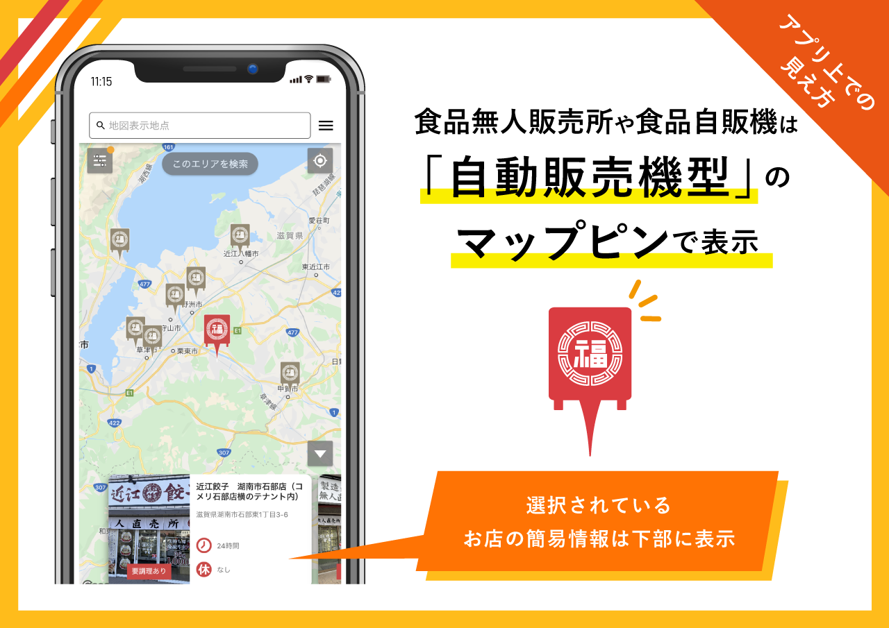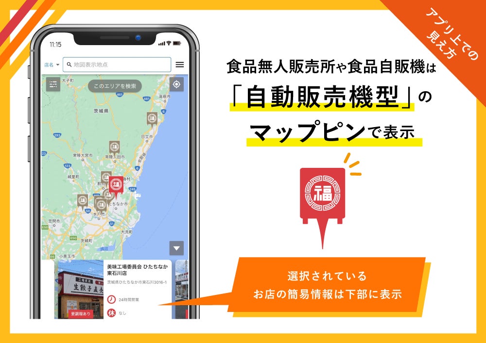美味工場委員会の無人販売店が「自動販売機型」のマップピン(ジャンル:中華)で表示されます。