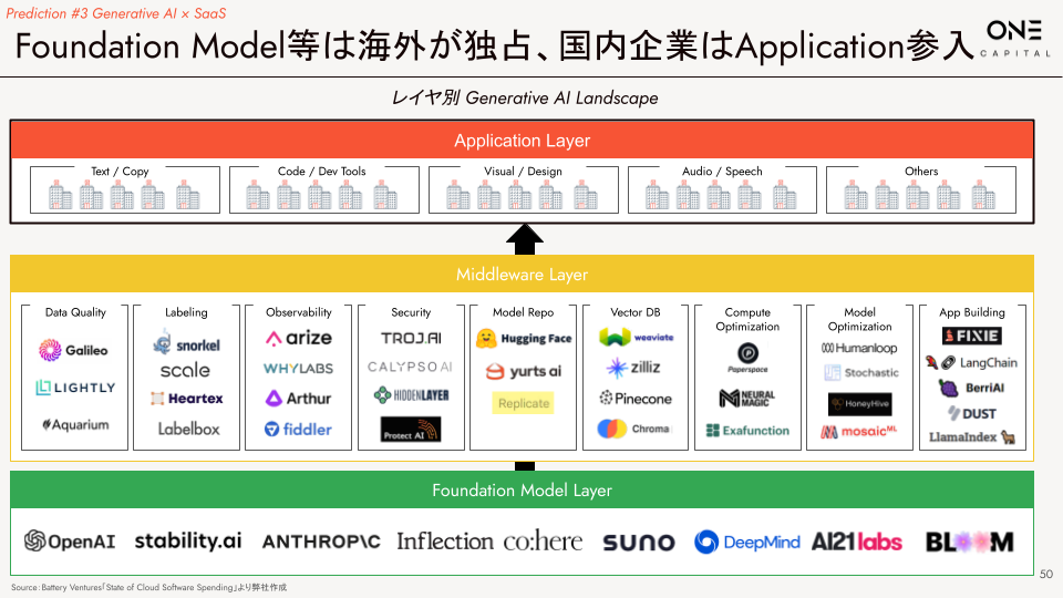 Generative AIの「Foundation Model(OpenAIなど)」「Middleware(Hugging Faceなど)」レイヤではすでに海外企業が覇権を握っています。そのため、Application(SaaS)レイヤへ参入する国内企業が急増すると予測しています。