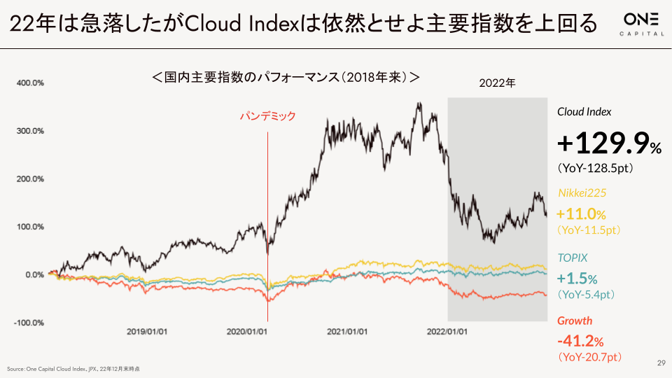 2022年は、米国の利上げによりテック企業やIPOしたばかりのスタートアップの株価が下落し、景気後退懸念からベアマーケットが続いたことで、国内市場も大きく下落しました。SaaS企業もその影響を受け、「One Capital Cloud Index」は128.5pt下落しました。