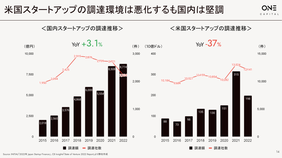 一方、米国SaaSスタートアップの調達額は26.5%減の720億ドル、調達件数は18.4%減の3,777件と急減速しました。21年の反動が22年にやってきたと考えられます。
