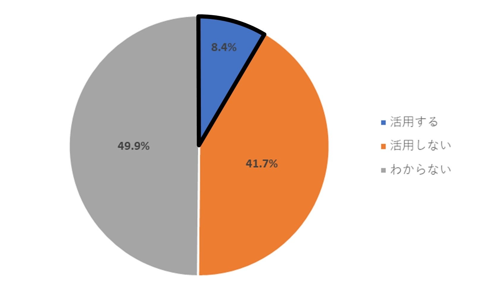 賃上げ促進税制を「詳細まで知っている」「詳細は知らないが制度自体は知っている」と回答した方に活用の有無について聞いたところ、「活用する」は僅か8.4%であった。「わからない」の回答が最多の49.9%を占め、「活用しない」の回答が41.7%であった。