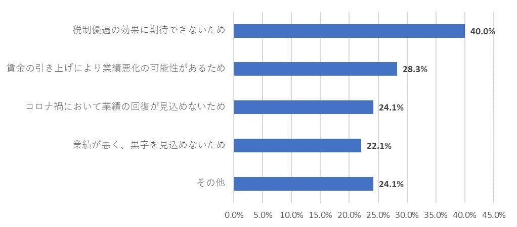 賃上げ促進税制を「活用しない」と回答した方に対してその理由を聞いたところ、「税制優遇の効果に期待できないため」が最多の40.0%であった。次いで「賃金の引き上げにより業績悪化の可能性があるため」や「コロナ禍において業績の回復が見込めないため」などの回答があった。