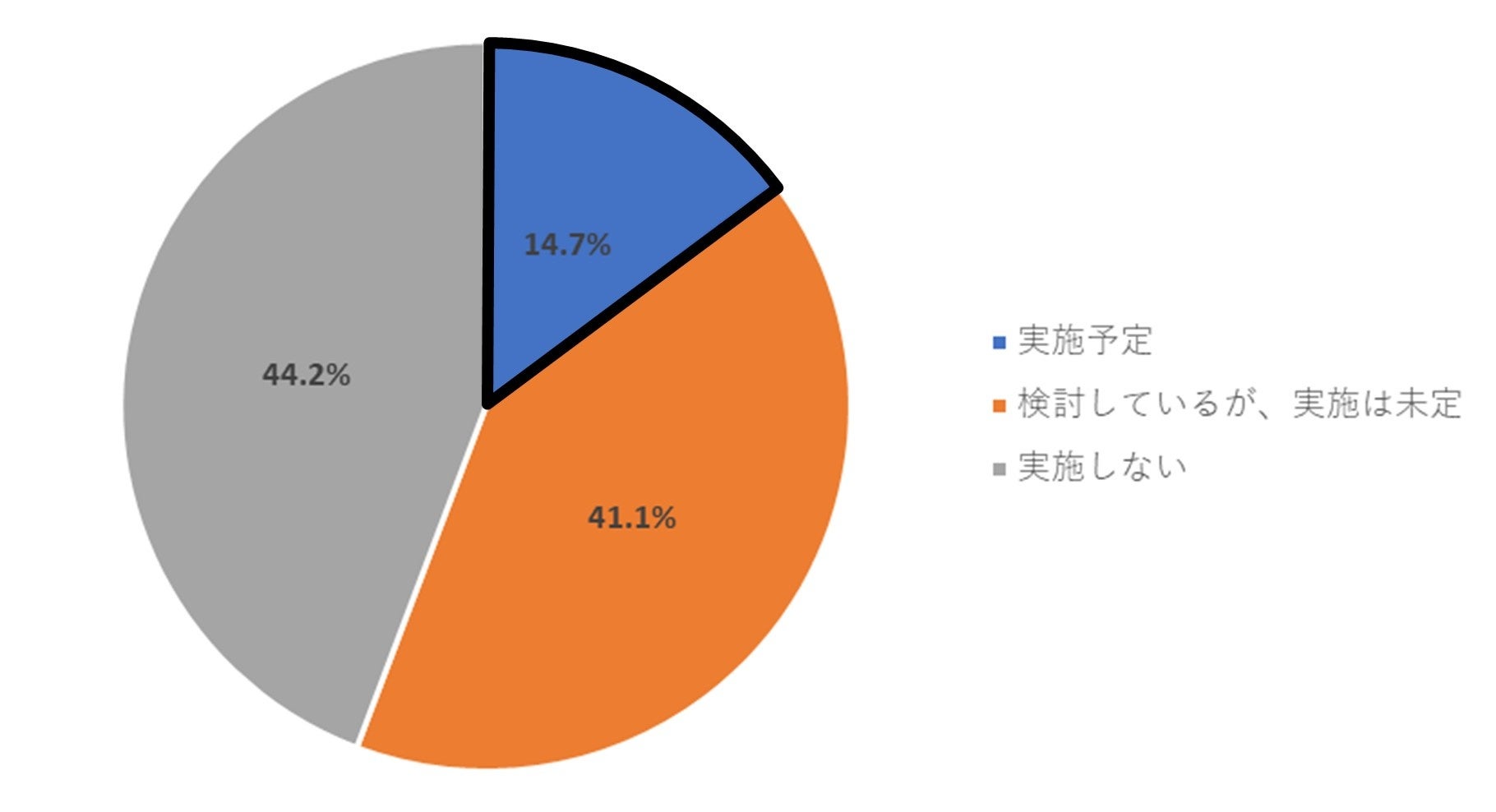 今後の賃金引き上げの有無について聞いたところ、「実施予定」と回答した方は14.7%、「検討しているが、実施は未定」が41.1%、「実施しない」が44.2%という結果になった。