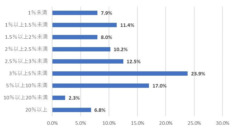 賃金の引き上げを「実施予定」と回答した方に対して、具体的な増加額について聞いたところ、「3%以上5%未満」が最多の23.9%、次いで「5%以上10%未満」が17.0%、「2.5%以上3%未満」が12.5%、「2%以上2.5%未満」が10.2%、「1.5%以上2%未満」が8.0%という結果になった。全体の80.7%が、賃上げ促進税制で中小企業における税額控除の対象となる1.5%以上の賃上げをすることが分かった。