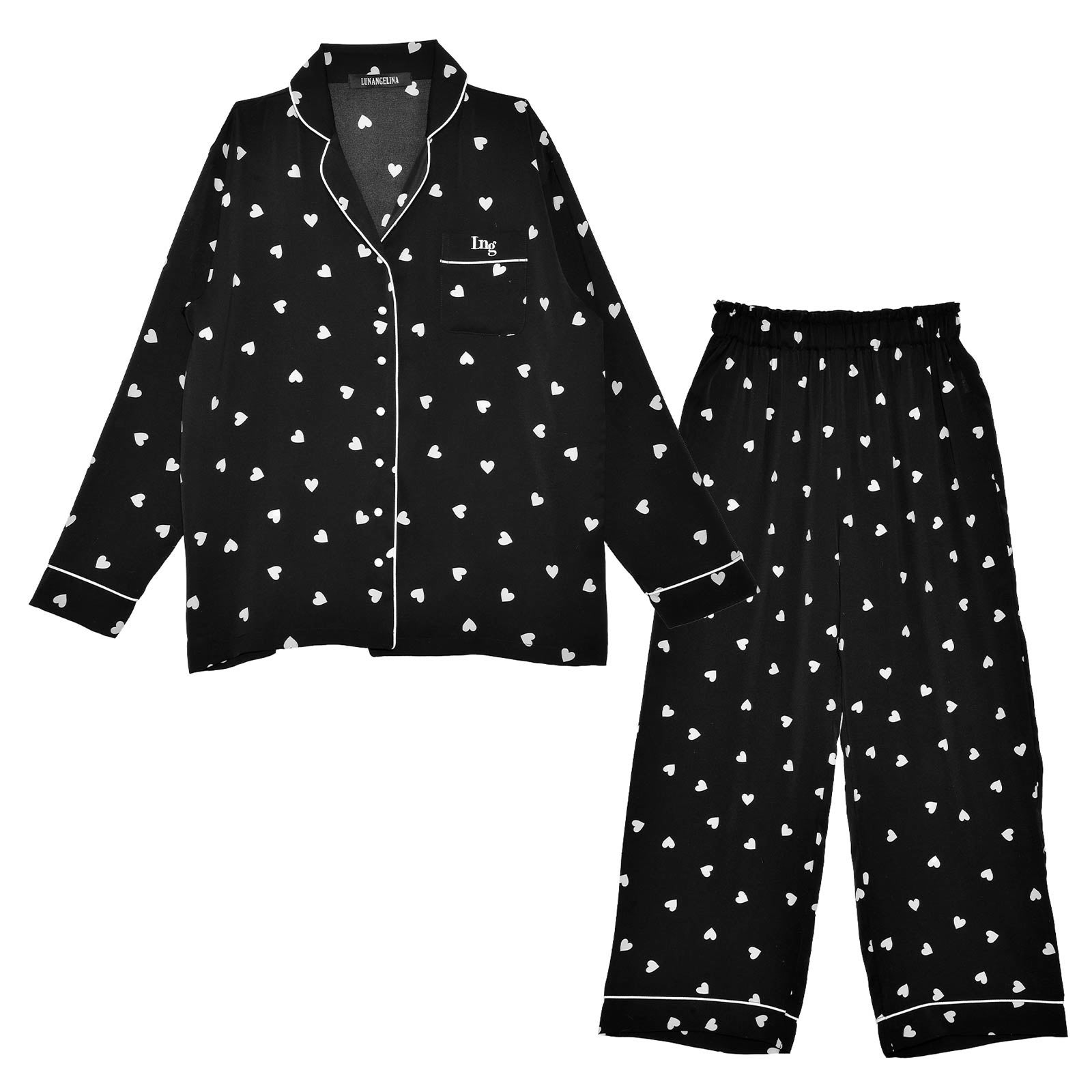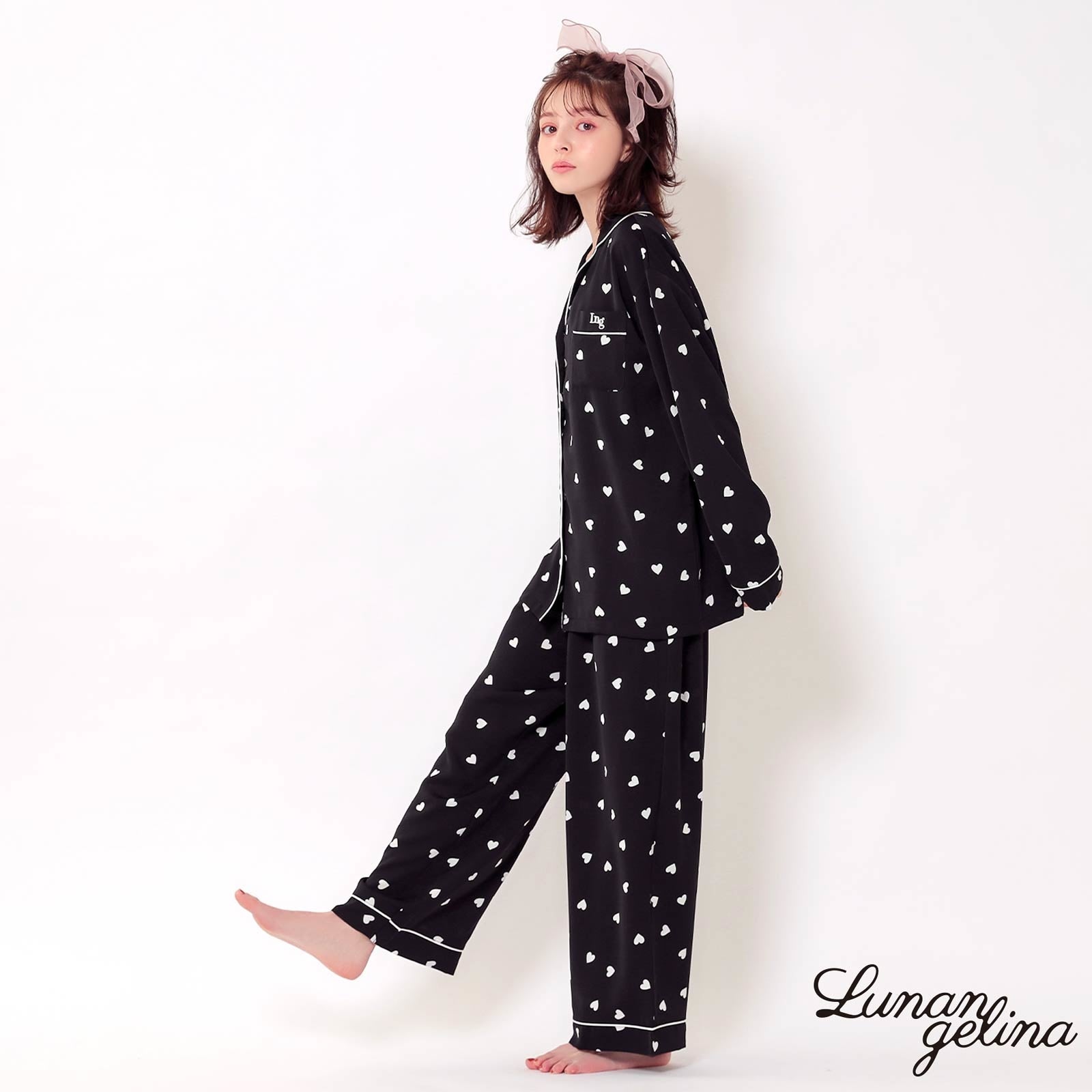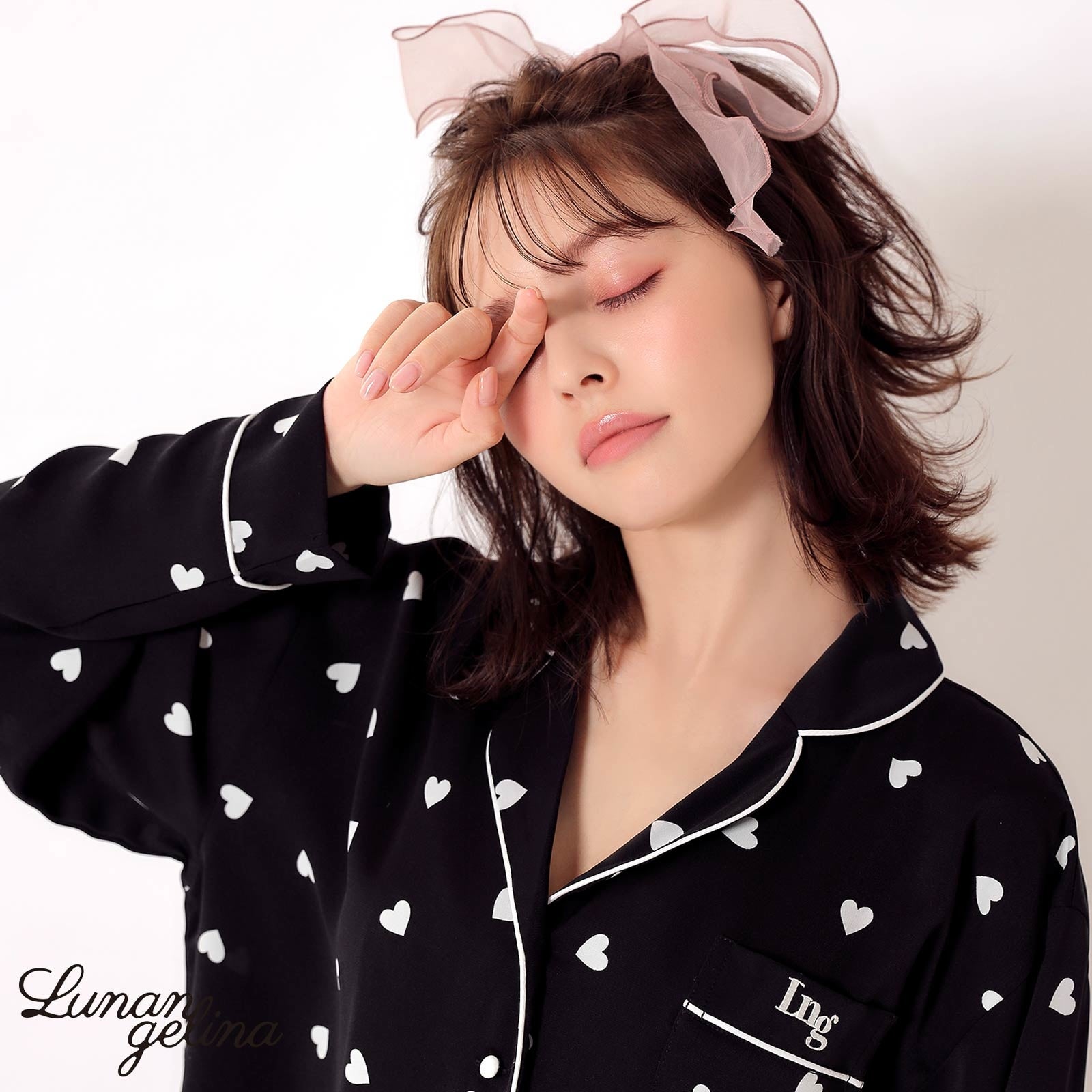 程よい艶感のあるサテン生地にハート柄のプリントをしたルームウェア。