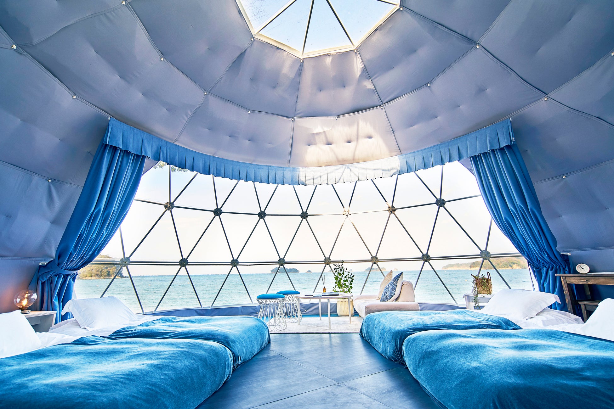 このたび「グランオーシャン伊勢志摩」では、5周年を迎えるにあたり、伊勢志摩の海を象徴する「青」をテーマに、味覚・視覚・香りに至るまで世界観にこだわり、“青”を感じる記念体験「~海辺で過ごす特別な時間~Blue Voyage」をご用意しました。これまでのご愛顧への感謝とともに、自然と調和した非日常のグランピングステイをお楽しみいただけます。
