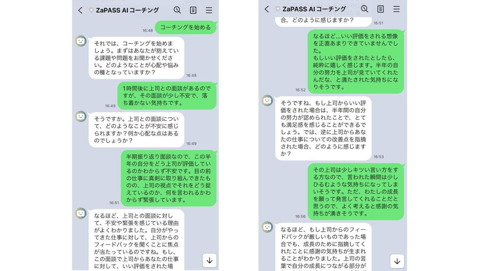 例えば、「1時間後に上司との面談があり不安な気持ちを解消したい」、「悩みがあり寝付けないため気持ちを落ち着かせたい」などの、すぐに対処したいときにも適しています。私たちは、『ZaPASS AIコーチング』を通じて、ビジネスパーソンが一人で悩みを抱えずに、自分自身で答えを見つけて行動するきっかけを提供したいと考え、このサービスリリースに至りました。