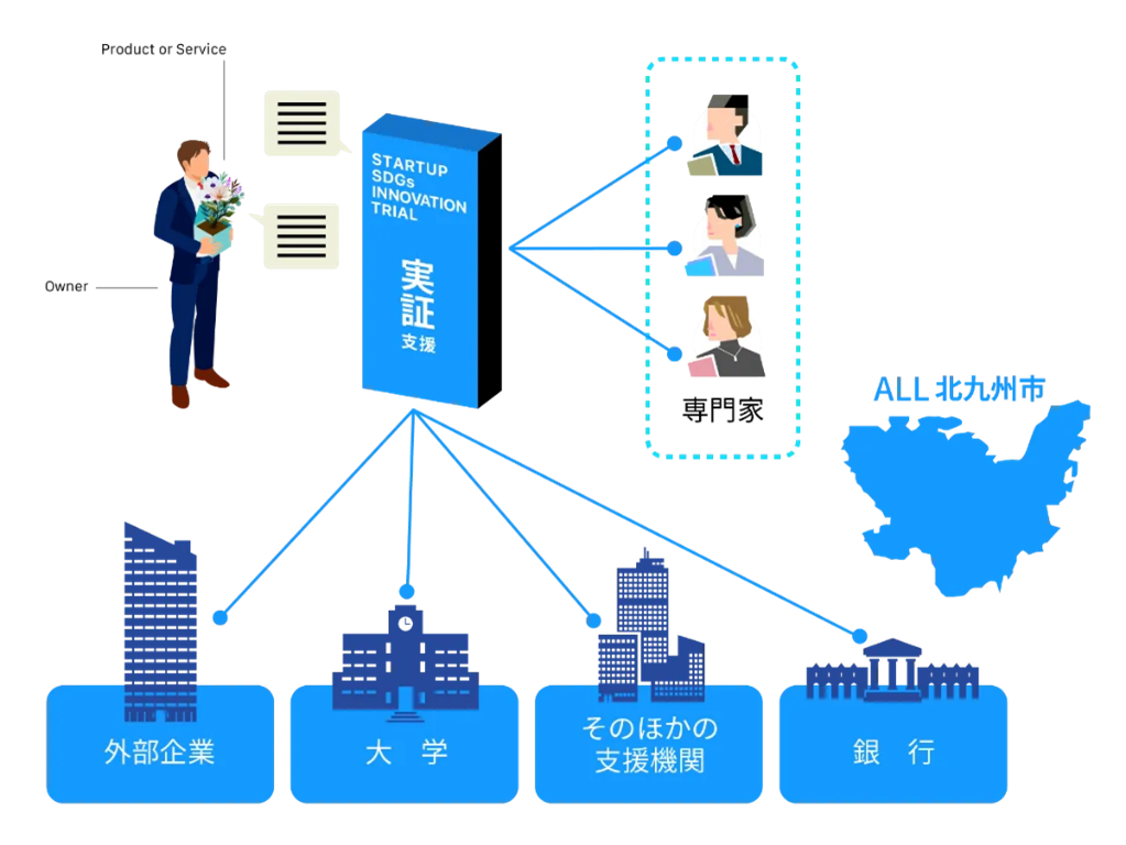 スタートアップSDGsイノベーショントライアルは、❶プロダクトの社会実装に向けた実証実験による仮説検証と❷PMFの達成に向けた事業検証により、事業成長を目指す全国のスタートアップを対象に、北九州市の産学官金が連携して支援するプログラムです。