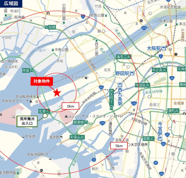 当計画は、大阪市此花区酉島に大阪ガス株式会社が所有する土地の一画に位置し、大阪駅まで約7kmと大阪都心部へのアクセスが良好かつ阪神高速5号湾岸線「湾岸舞洲」出入口まで約3.9㎞と、都市部および広域への配送の双方に対応可能な物流適地に立地しております。また、近隣に競合物件が少なく、大阪シティバスの「常吉一丁目」バス停から徒歩6分と従業者の通勤利便性に優れており、人材確保に優位性のある立地です。