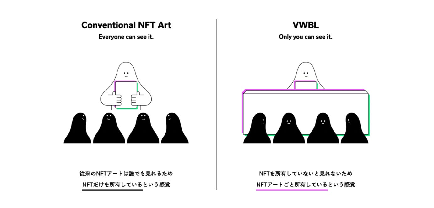 VWBLはNFTを持っている人しかデータを見ることのできない分散型アクセスコントロールNFTです。インターネット上のデータパッケージとして、デジタルコンテンツやパーソナルデータなど、特定の人にしか見せたくないデータに対して、手紙を封筒に入れるように不可視にすることが可能となり、様々な事業に活用することができます。