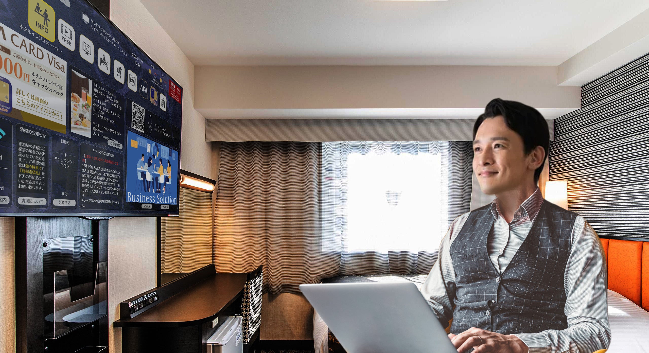 「おもチャンネル」は、ビジネスホテルの客室内テレビモニターを活用した動画広告メディアです。入室時にカードキーを差し込んだ際、照明が点灯すると同時にテレビが自動的に立ち上がり、音声付きでCM動画が流れます。客室というプライベートな空間で1日1室あたり平均4回以上同一の動画が流れるため、宿泊者への広告到達率は75%以上と非常に高いことが特徴です。