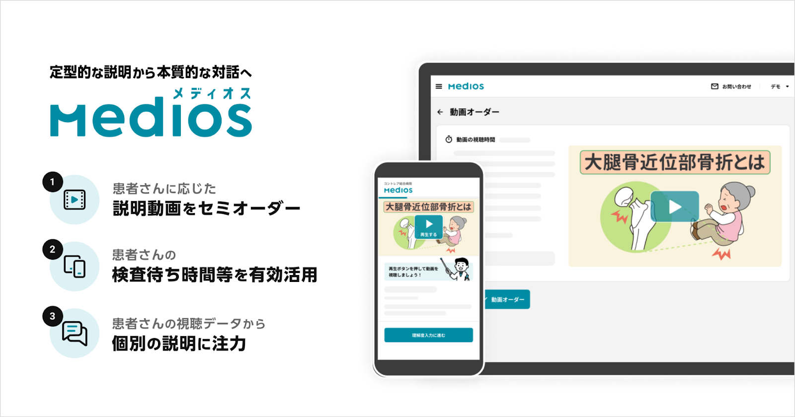 MediOS 動画説明は、医療機関で日々行われている手術や検査などの定型的な説明を、あらかじめ患者さんにわかりやすいアニメーション動画を視聴してもらうことで、医療従事者の業務削減と患者さんの理解度や満足度の向上が両立できるサービスです。