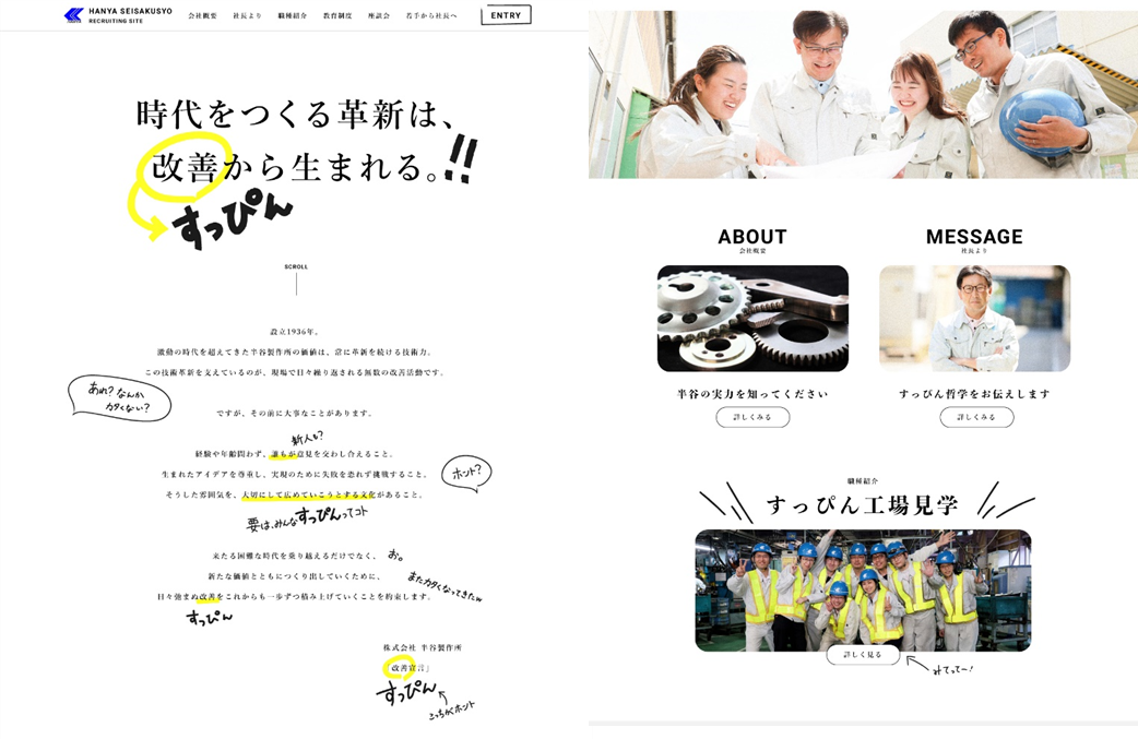 株式会社半谷製作所では、社員様それぞれがありのままで働けることが技術力の向上につながっていました。自然体で働けることを「すっぴん」という言葉で表現し、すっぴんでいられる環境の根源となる考えや、すっぴんだからこそ得られている半谷製作所の強みを、真面目な文章に脱力感のあるフォントで本音らしさを感じられる言葉が落書きされていくサイト上の演出で、会社としての真面目な考えとすっぴんの社風を表す広告を制作しました。