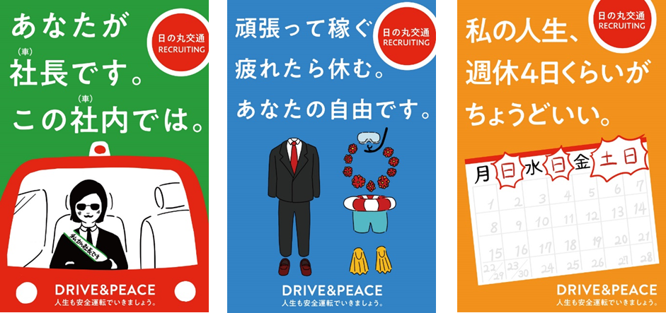 タクシー会社である日の丸交通株式会社では、仕事量や働く時間を自分で決め、働き方を自分らしくカスタマイズすることができます。日の丸交通株式会社には、実際に多様な働き方を支援する制度や文化が浸透していますが、学生にはその実態が見えづらく、業界イメージも相まってなかなか伝わりにくいものでした。この課題を解決するために、いたって真面目なコピーと少しユニークなイラストとともに表現することで、学生に伝わりやすい広告になるよう制作いたしました。