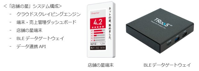「店舗の星」は、EC の世界で極めて重要である、商品及び店舗に関する消費者評価(ソーシャルプルーフ)をネット上よりクラウドエンジンがスクレイピングし、リアル店舗に落とし込み、表示するためのシステム(以下、「店舗の星」システム※)になります。小売店舗で商品を購入する際、馴染みがなかった商品や、嗜好性の高い商品を選択するには、お客様のその商品に対する認知度が重要な鍵となります。一方、お客様が商品選択に費やす時間は、低額商品の場合、ほんの数秒であることから、お客様が数秒以内に認知可能であり、かつ、商品の良さの定量的判断の助けとなる「店舗の星」は、リアル店舗の販売促進に大きな役割を果たしてまいります。また、当社の提供する「店舗の星」システムは、単にお客様評価を商品に表示するだけではなく、「店舗の星」を取り付ける前と取り付けた後の効果計測が可視化できるクラウドダッシュボードを有しており、店舗の POS データと連携することで店舗運営の BI ツールとして極めて大きな役割を果たしてまいります。