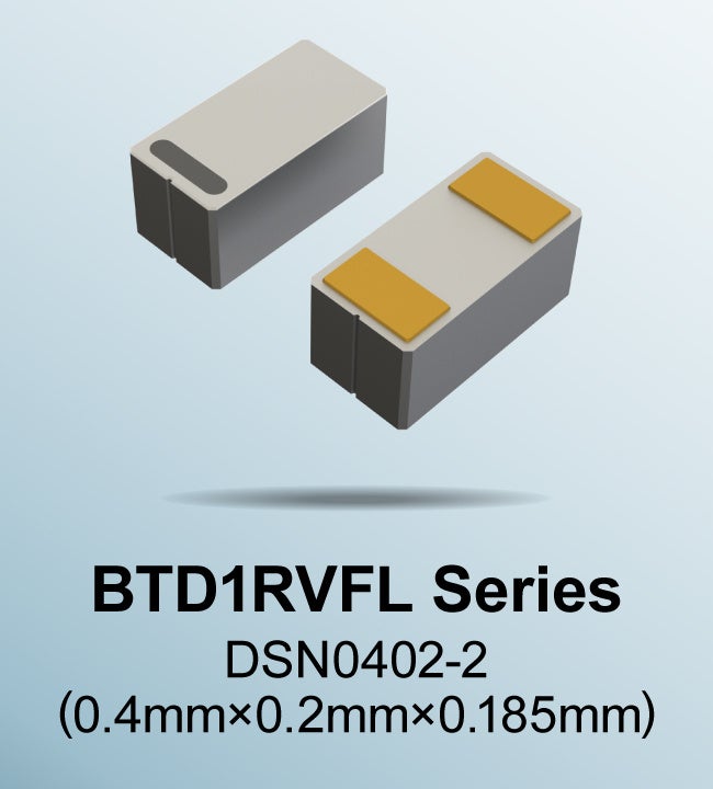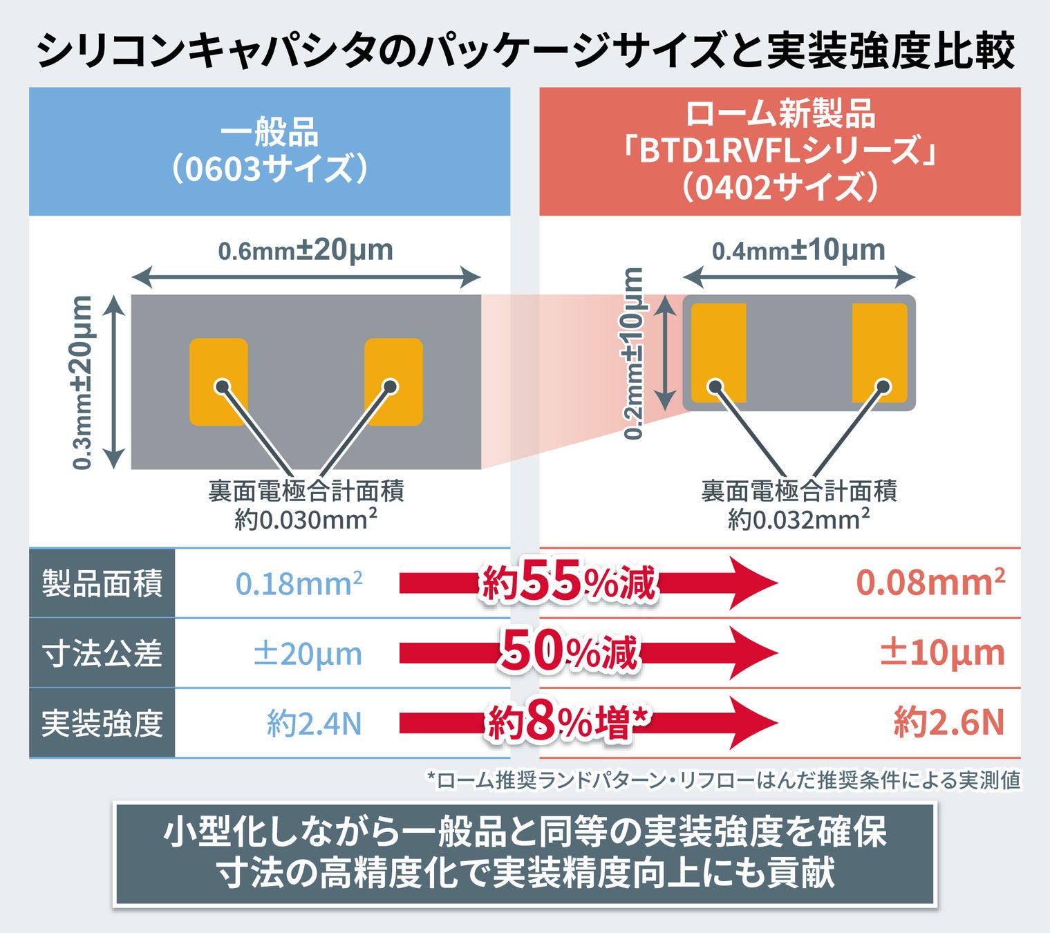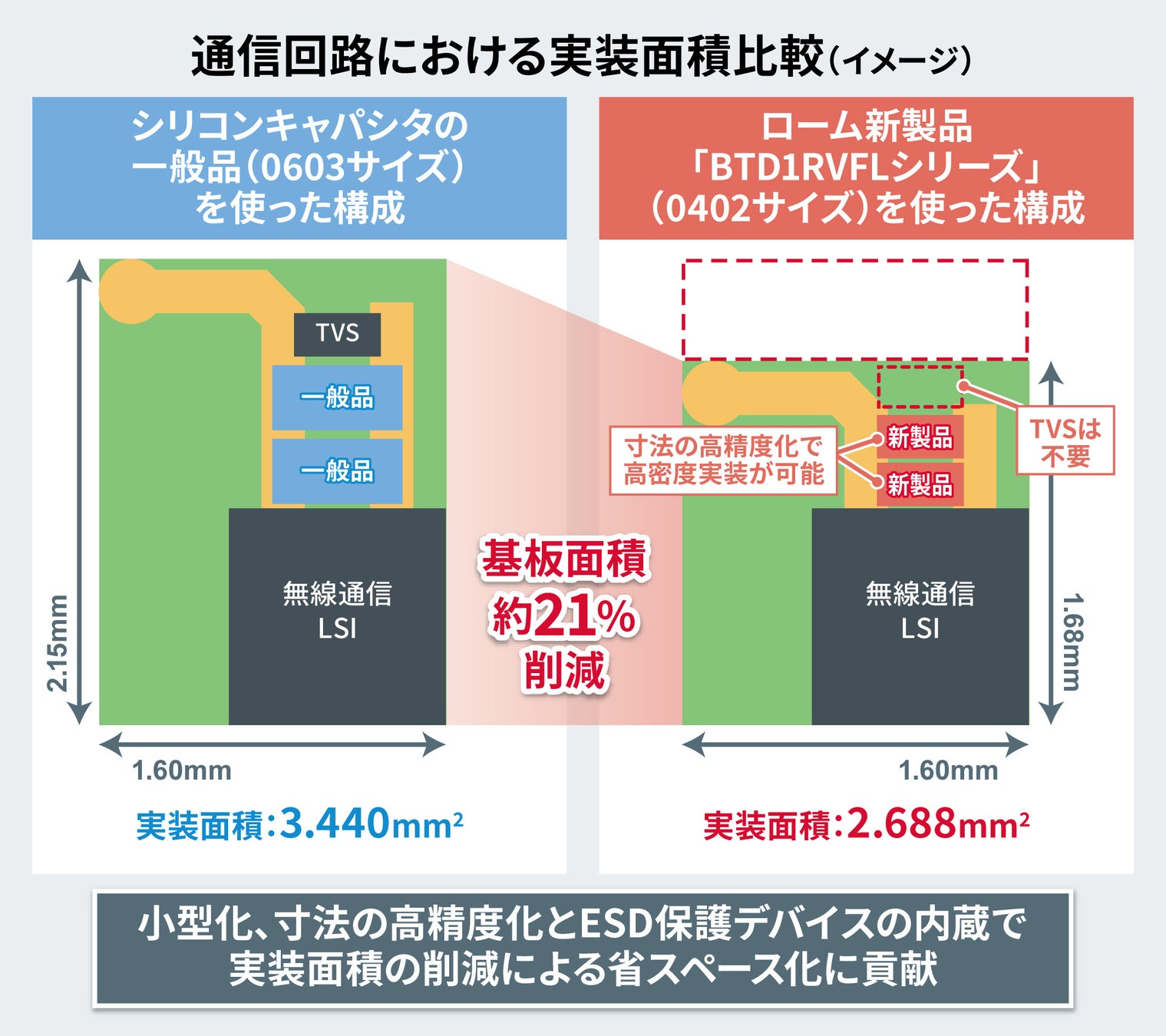 第1弾となる「BTD1RVFLシリーズ」は、面実装タイプの量産品シリコンキャパシタとしては業界最小(※)の0402(0.4mm×0.2mm)サイズを実現しました。一般品の0603サイズと比べて実装面積は約55%減の0.08mm2となることから、アプリケーションの小型化に貢献します。また、TVS保護素子を内蔵して高い耐ESD(*2)性能も確保しており、サージ対策など回路設計の工数も削減できます。