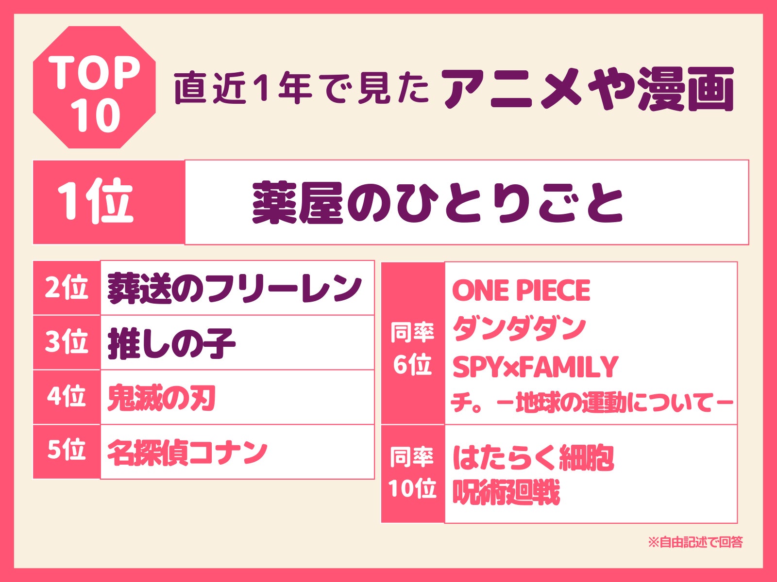 今回1位、2位にはすでに放映が終了しているアニメ、「薬屋のひとりごと」「葬送のフリーレン」がランクインしている。これらは放送終了後も、原作漫画や小説などを通して人気が継続している様子。また、3位にはドラマ配信がスタートし、映画化も決まっている「推しの子」が返り咲いている。6位以下には、今期新番組でスタートしている話題作の「ダンダダン」、「チ。-地球の運動について-」が挙がってきている。映画化が決まり、メディア露出が増えている「はたらく細胞」もランクインしている。