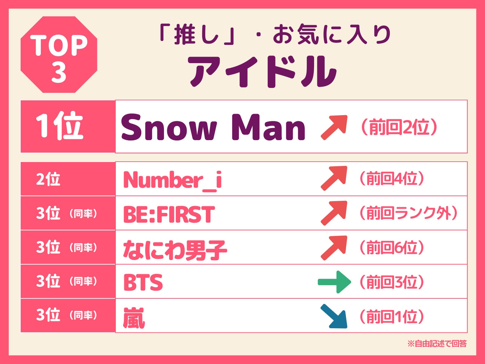 推しアイドル部門:Snow Manが1位。前回ランク外だった「BE:FIRST」が急上昇。