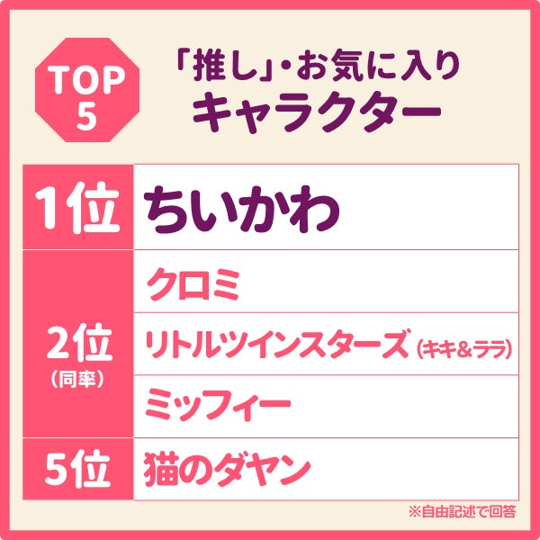推しキャラクター部門:ちいかわが引き続き1位。2位と3位には3世代にアピール出来ているサンリオのクロミ、リトルツインスターズ(キキ&ララ)がランクイン。