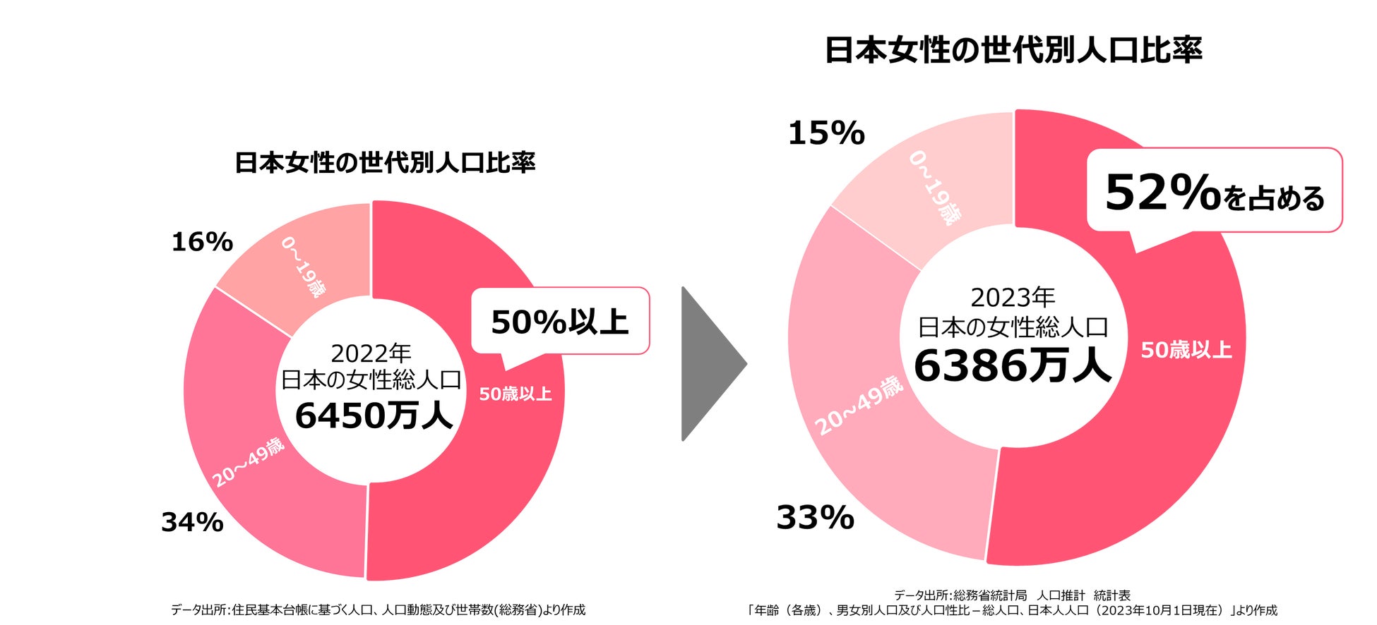 2022年から比べても50代前後の女性の人口は増加している。また同様に、有職者比率も高まっており、ミドルシニアでも仕事を続けているケースが目立つ。