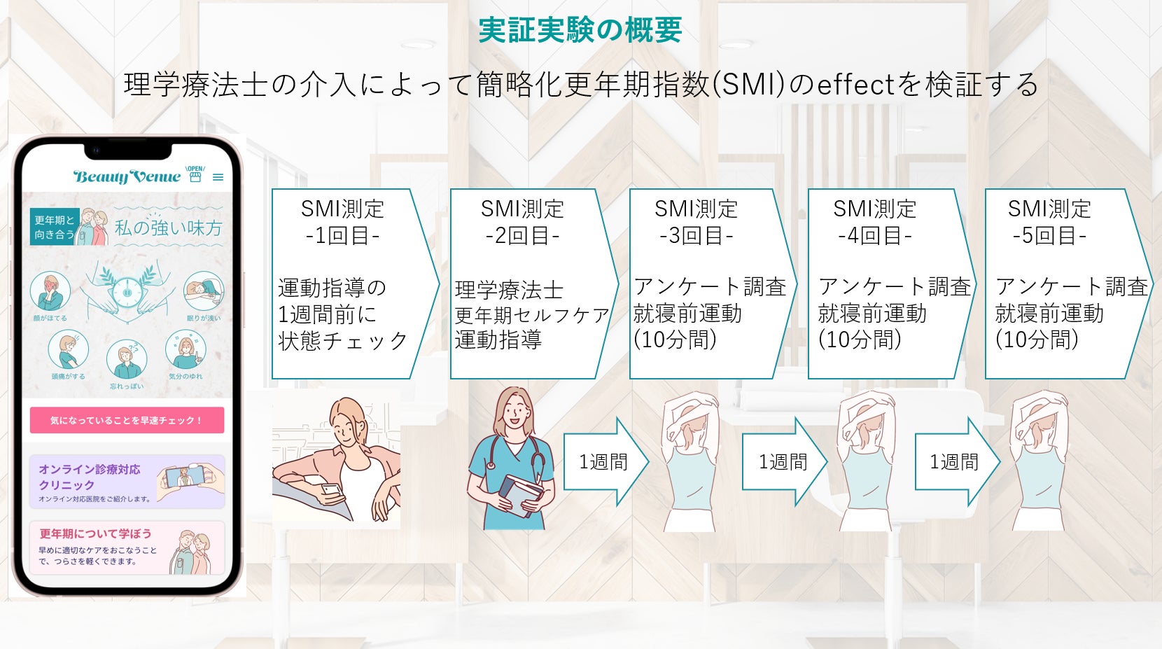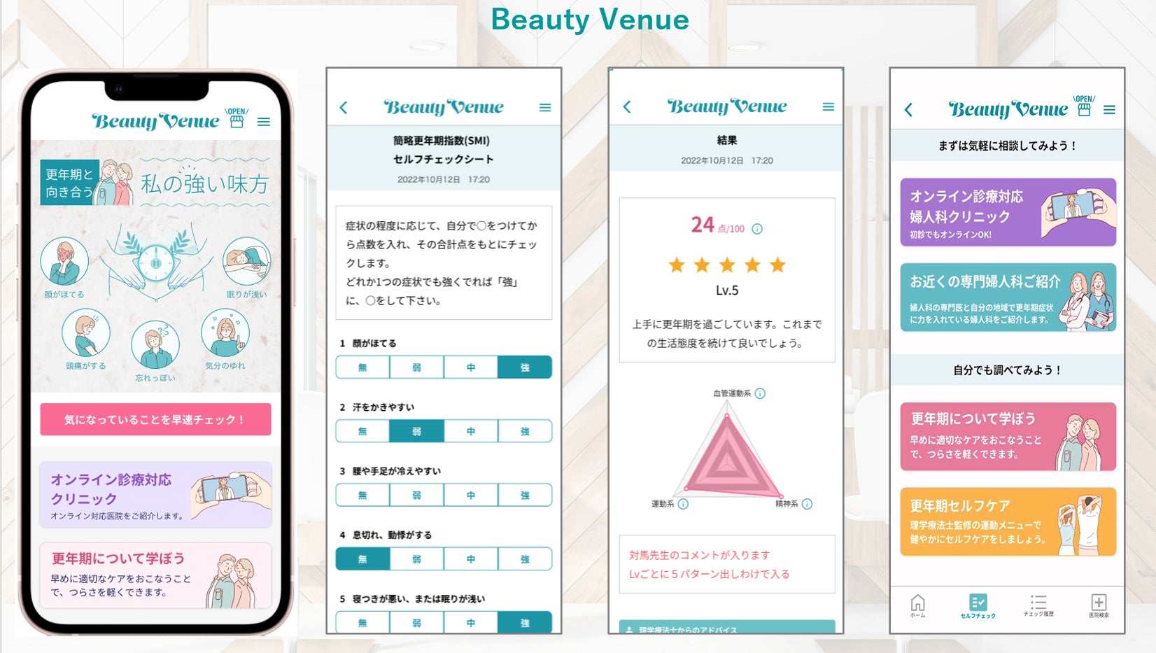 ウィメンズヘルスの功績高い対馬ルリ子医師監修のもと女性理学療法士が提供できる更年期に特化したメニュー。婦人科で使用する簡略化更年期指数カウンセリングシート(=SMI)をアプリ”Beauty Venue”に実装し、結果に応じた6種類の運動メニューを理学療法士が選択し指導を行います。