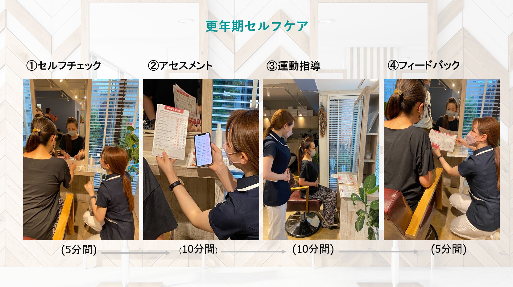 そこで本実証では、多くの女性が利用する美容室において、将来的に美容室が気軽に健康相談できる場となることも視野に入れ、まずは美容室で働く女性を対象に、更年期症状のセルフチェックと理学療法士のアセスメント(評価)に基づいた運動方法を実践することで更年期症状に変化が現れるかを検証します。