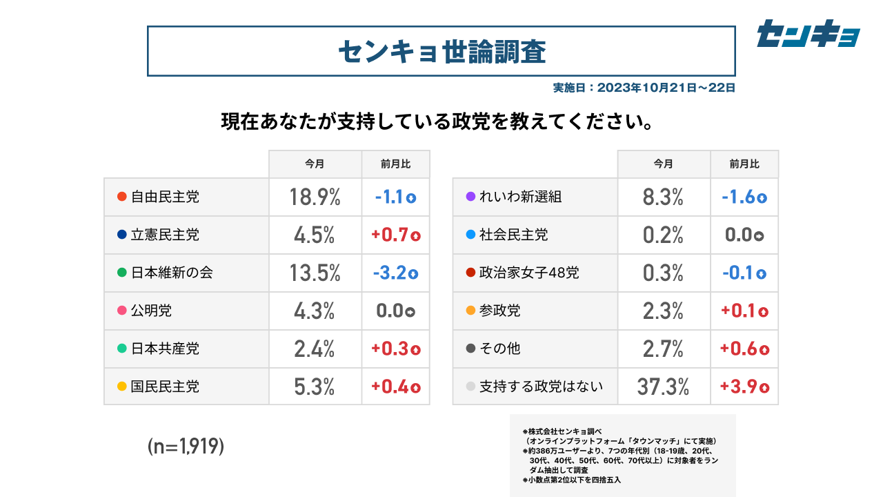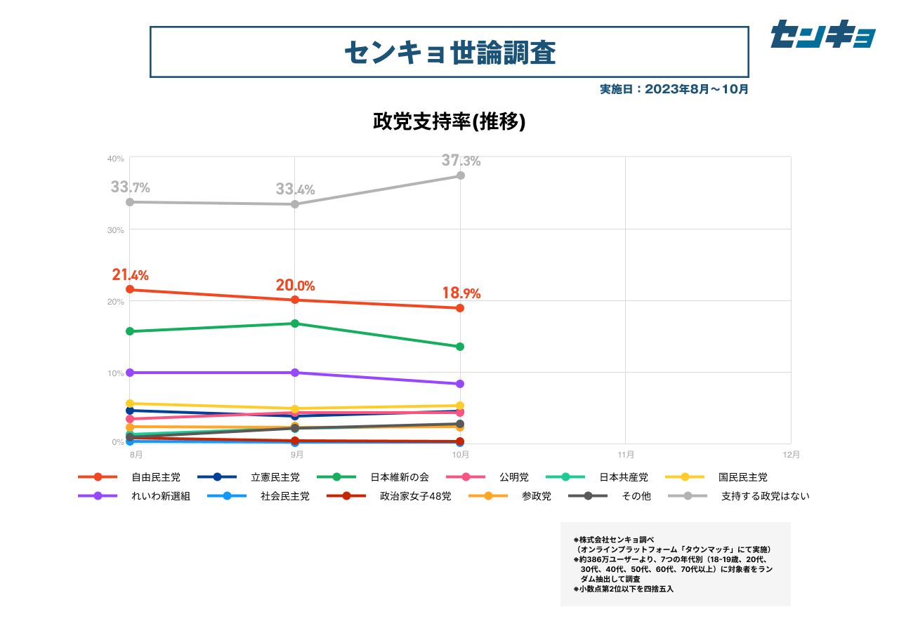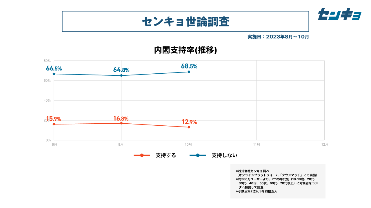 【株式会社センキョ】タウンマッチ定期世論調査、10月の内閣支持率は12.9%
