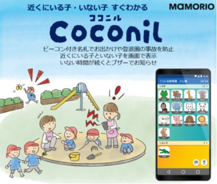Coconil(ココニル)は、「IF(もし)園児が保育士さんから離れてしまうと、THEN(そのとき)アラームが鳴る」という見守りアプリです。園児にビーコン付き名札を着けてもらうことにより、ビーコンの電波が届く範囲に園児がいることを確認し、電波が届かないほど園児が離れてしまうと、「いない子」のエリアに表示されて、アラームが鳴って保育士さんに伝えます。また、園児たちが何人いるかを素早く数える点呼機能も搭載。日々の保育の場面で安全と効率化を実現します。