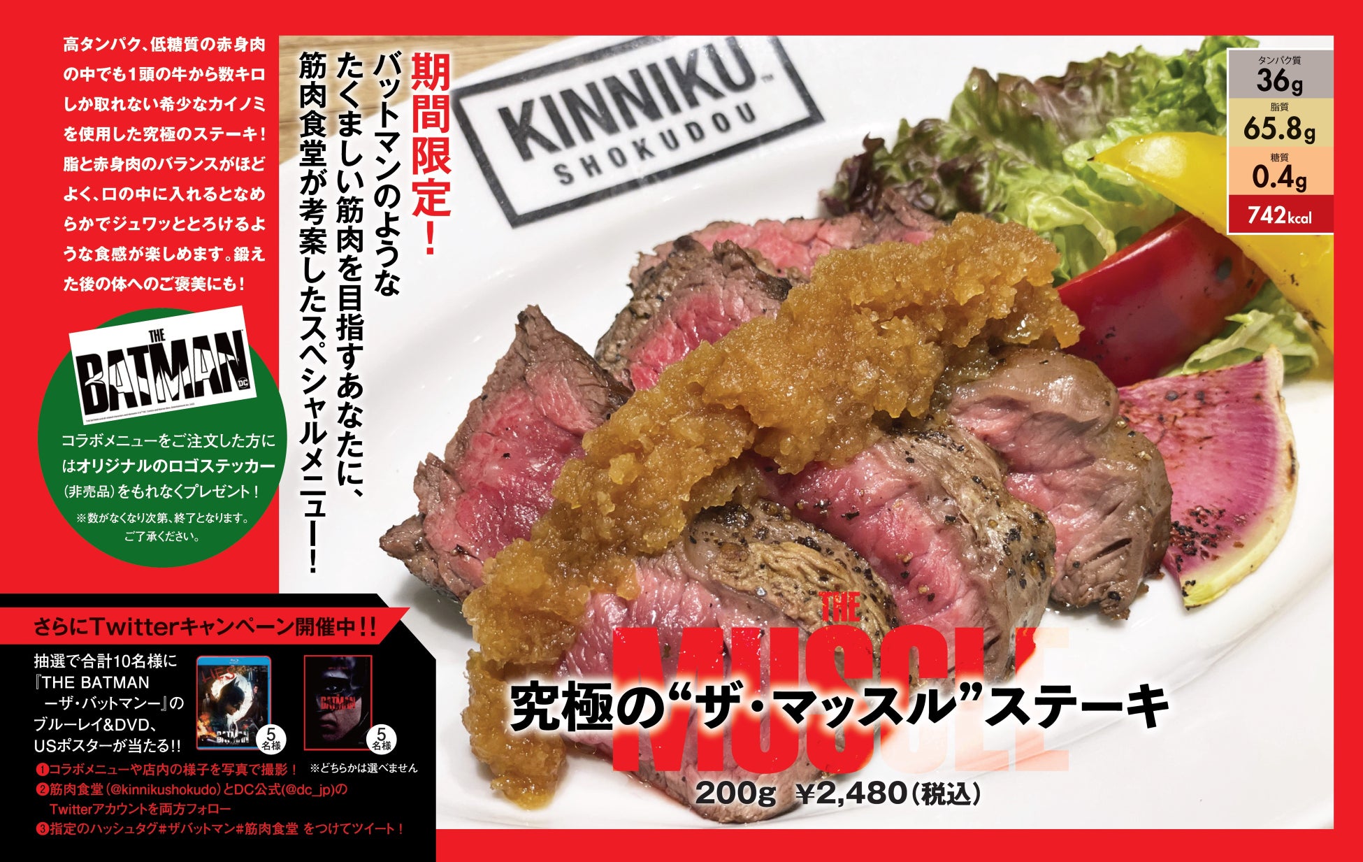 映画『THE BATMAN-ザ・バットマン-』と筋肉食堂のスペシャルコラボレーションが決定!!バットマンのようなたくましい筋肉を目指せ!期間限定メニュー「究極の”ザ・マッスル”ステーキ」が登場!