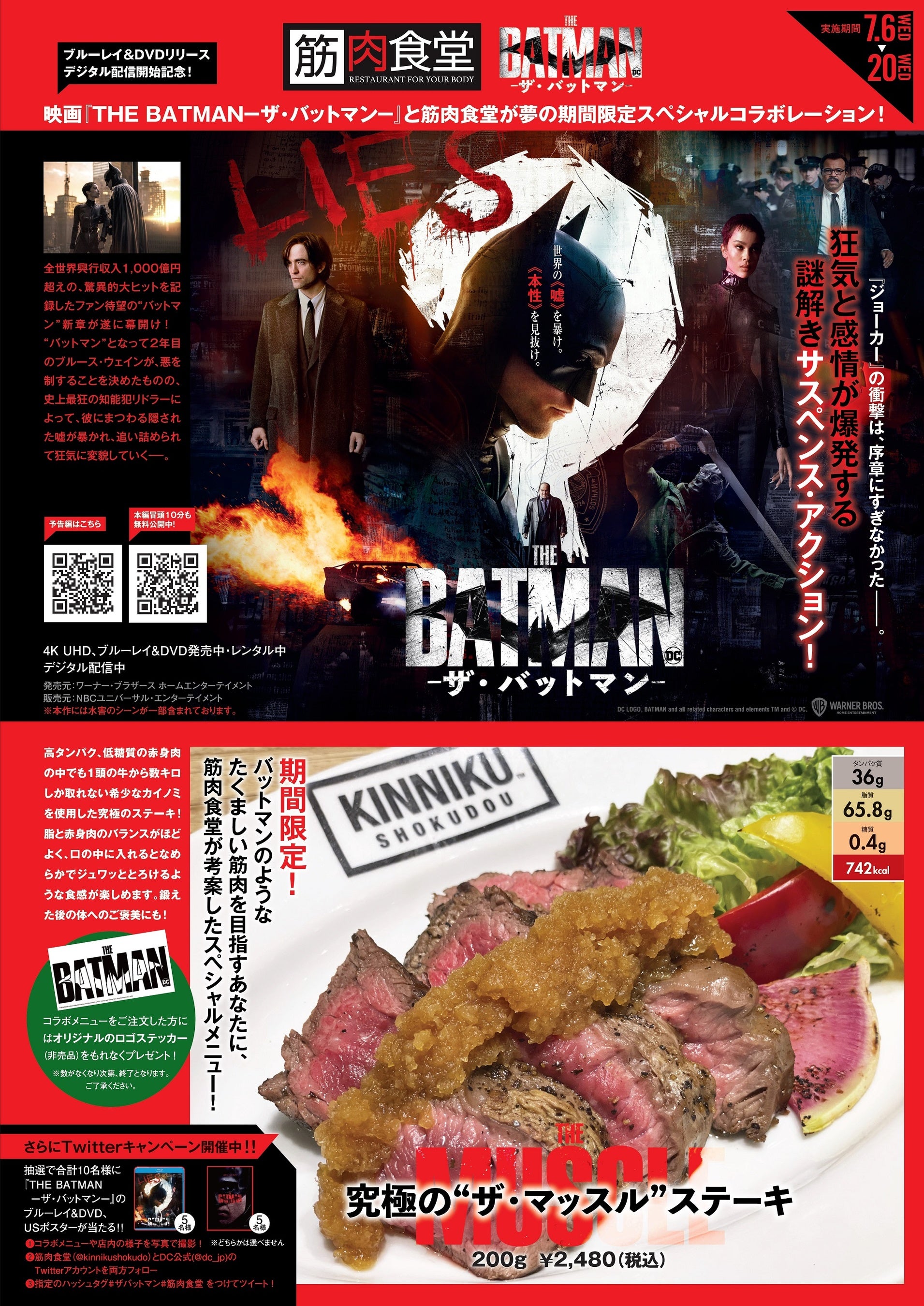 『THE BATMAN-ザ・バットマン-』の4K UHD、ブルーレイ&DVDリリース、デジタル配信を記念して、六本木、渋谷(2店舗)、銀座の都内4店舗で展開している高タンパク低カロリーグリルダイニング「筋肉食堂」とのコラボレーションが実現!