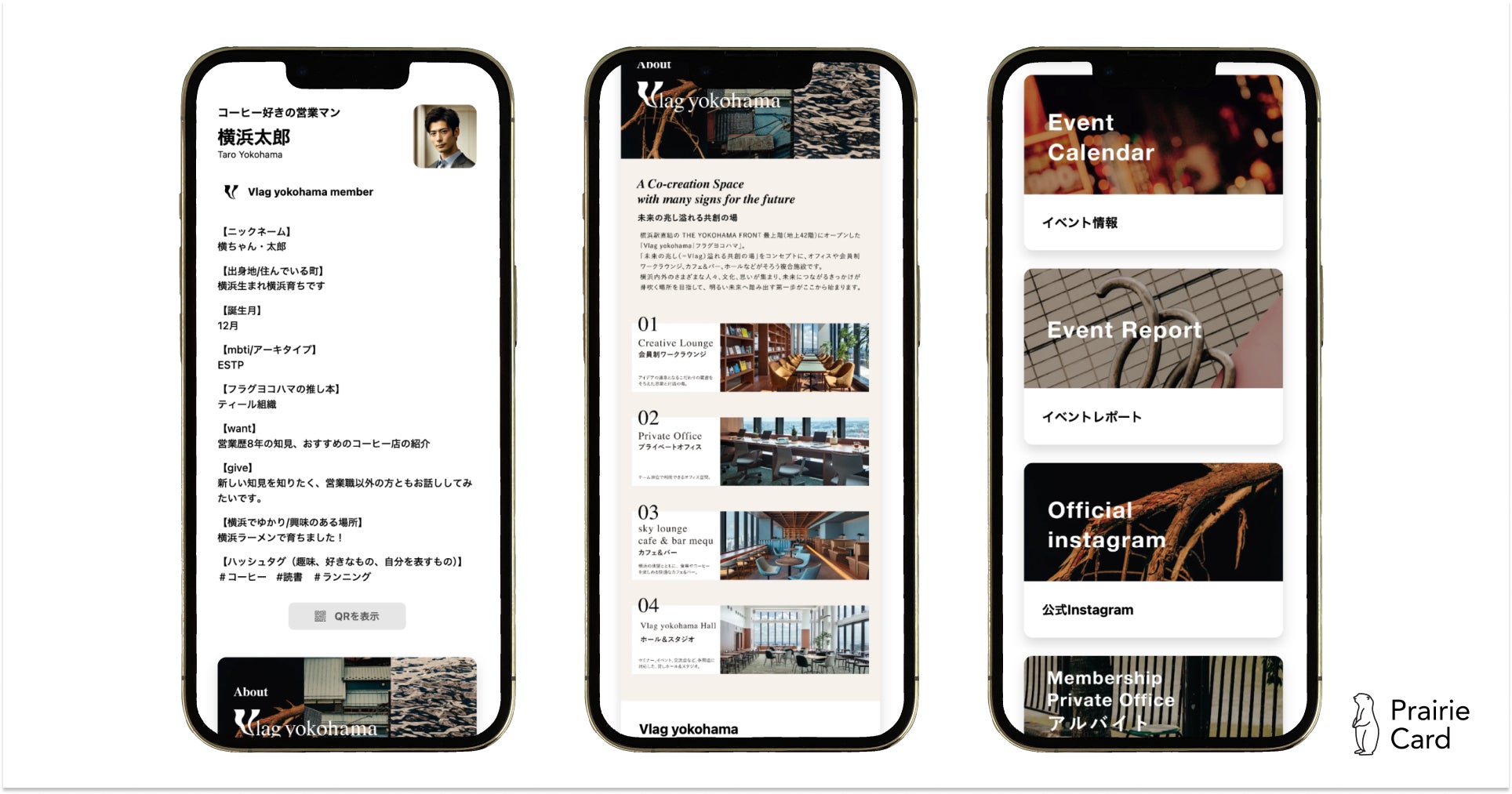 今回、当社は「Vlag yokohama」の事業共創パートナーに認定され、会員制ワーキングラウンジの会員証としてデジタル名刺「プレーリーカード for Business」を提供します。これにより、会員同士の円滑な交流を促進し、共創の可能性を広げるサポートを行ってまいります。