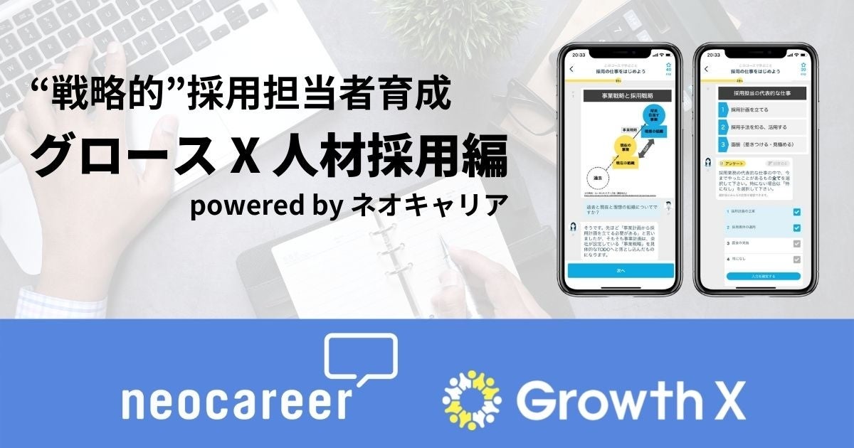 デジタル人材育成の学習アプリを運営する株式会社グロース X (本社:東京都渋谷区 代表取締役:津下本耕太郎)と、株式会社ネオキャリア(本社:東京都新宿区 代表取締役:西澤亮一)はこのたび、EdTech分野(※)で協業し、戦略的採用担当者育成を実現する学習アプリ「グロース X 人材採用編 powered by ネオキャリア」を共同開発、2022年5月より販売を開始することをお知らせします。