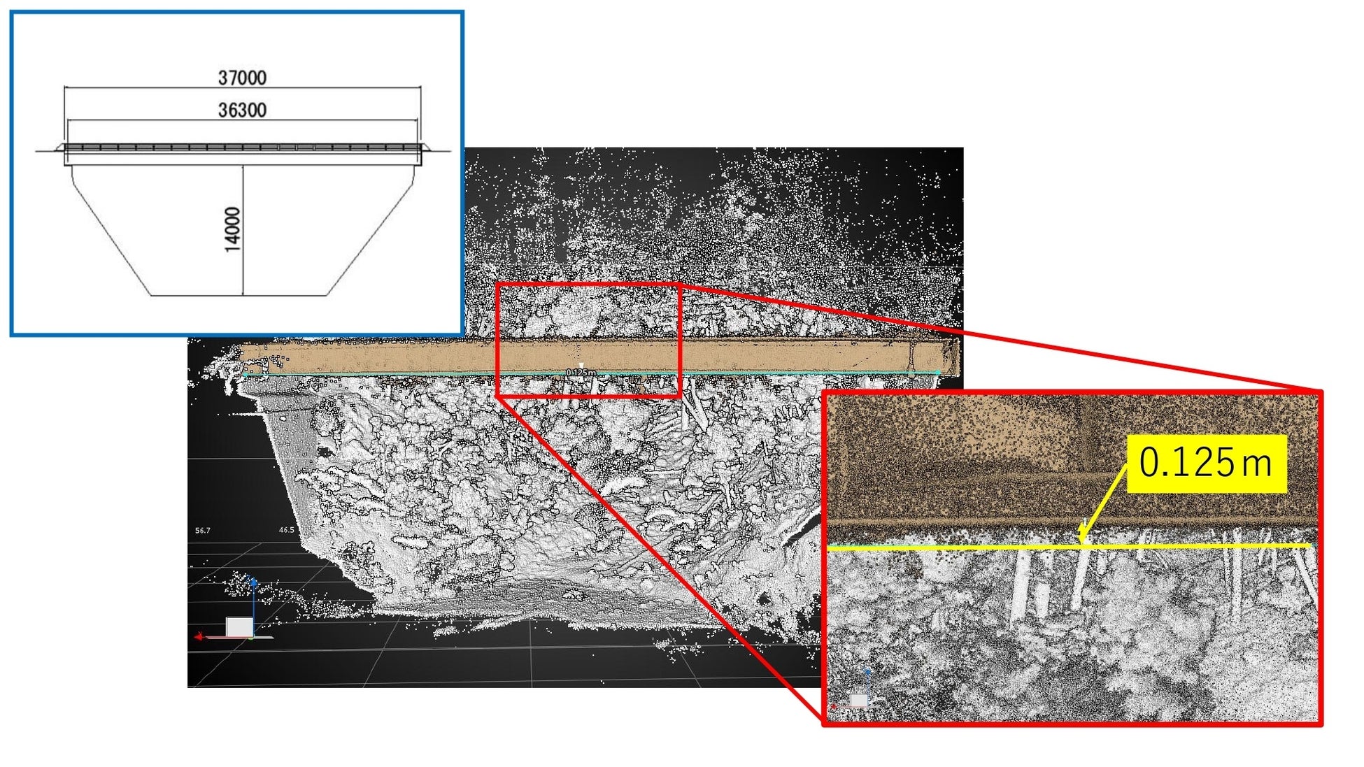MATRICE 350 RTKに搭載したZENMUSE L2で撮影・取得した橋梁全体の3D点群データを詳細に解析した結果、橋梁構造の「そり」が可視化されました。取得した点群データに対してフィルタリング処理を施し、構造物の主要部に対して直線を描画したところ、明確な「そり」が確認されました。このように「橋梁全体の3D点群化」を実施することで、前回調査との比較が可能となり、構造物の経年変化を定量的に評価できます。これにより、劣化の兆候を早期に発見し、事故や機能不全を未然に防ぐ「予知保全・予防保全」型の維持管理が、今後の社会インフラ点検での活用に期待されます。