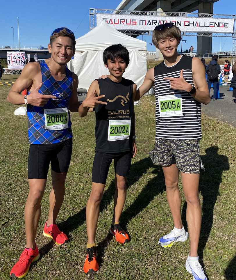 写真:SAURUSマラソンチャレンジ(2021/11)のゲストランナーとして出場。SAURUS JAPAN CEO嵜本晃次(左)、現サウルスアンバサダーサウリスト甲斐大貴(中央)、三津家貴也(右)