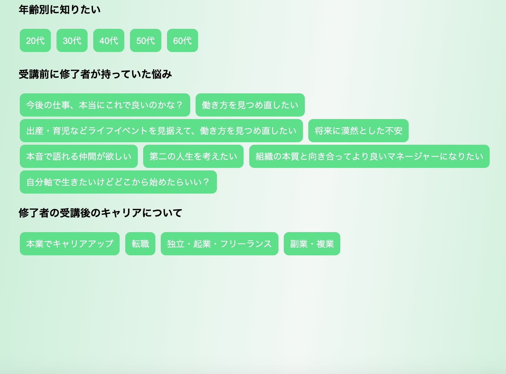 AIが質問に基づき、最適な修了生を紹介。受講前後の変化についても案内。