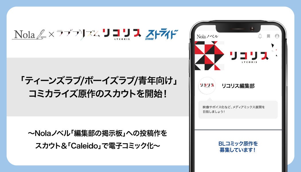 会員数40万人超の創作プラットフォーム「Nola(ノラ)※1」を提供する株式会社indent(本社:東京都千代田区、代表取締役社長:釜形勇気 以下、「indent」)と、エンタテインメントコンテンツを提供するカルチュア・エンタテインメント株式会社(本社:東京都品川区、代表取締役 社長執行役員:中西一雄)の子会社である株式会社BBB(東京都品川区上大崎 代表取締役社長:加瀬林亮、以下、「BBB」)は、2月9日(金)より、indentが運営する「Nolaノベル」で展開する「編集部の掲示板」へ投稿された原作に対し、電子コミック化に向けたスカウトをお送りいたします。このたびスカウトを開始するレーベルは、『ラブプリズム(ティーンズラブ)』『リコリス(ボーイズラブ)』『ストライド(青年向け)』です。