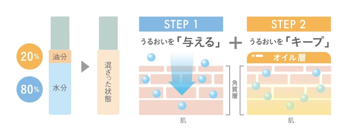80%の化粧水層と20%の美容保湿オイル層をシェイクして使用することで、うるおいあふれる透明ハリツヤ肌へ。