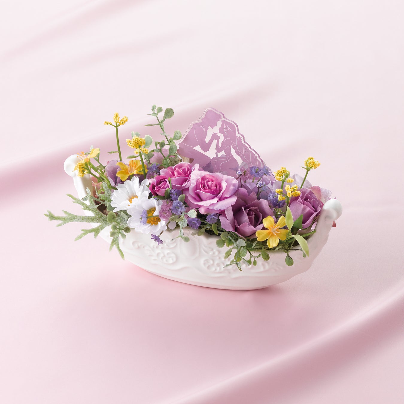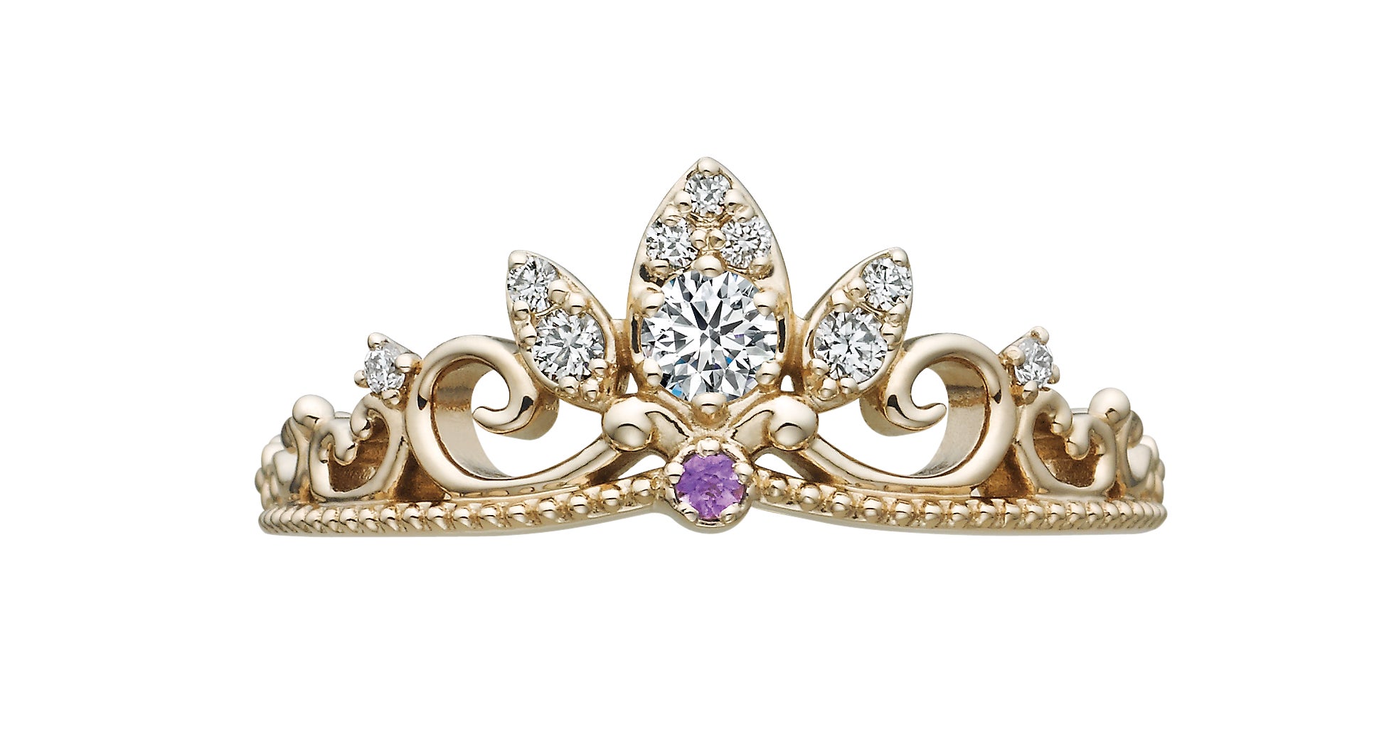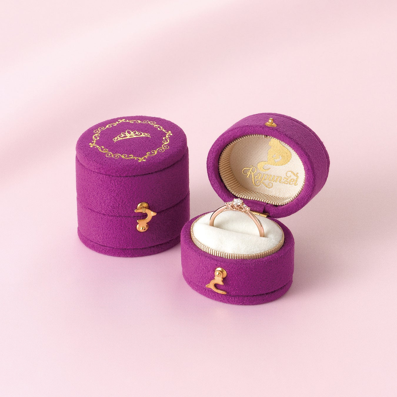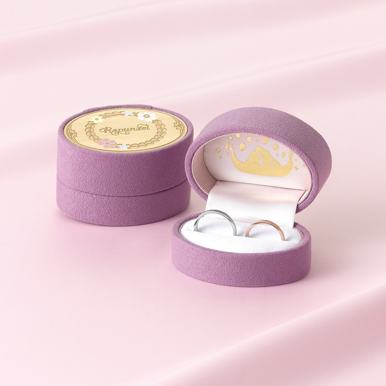 誕生日の夜空に放たれる不思議な光を見に行きたいというラプンツェルのたったひとつの願いをマリッジリングの1石のダイヤモンドとエンゲージリング側面に隠されたティアラに託したシリーズ。シンプルなデザインに、キラキラのテクスチャーがかわいいマリッジリングと、つい重ね着けしたくなるボリューム感のエンゲージリングがぴったり合うセットリングです。