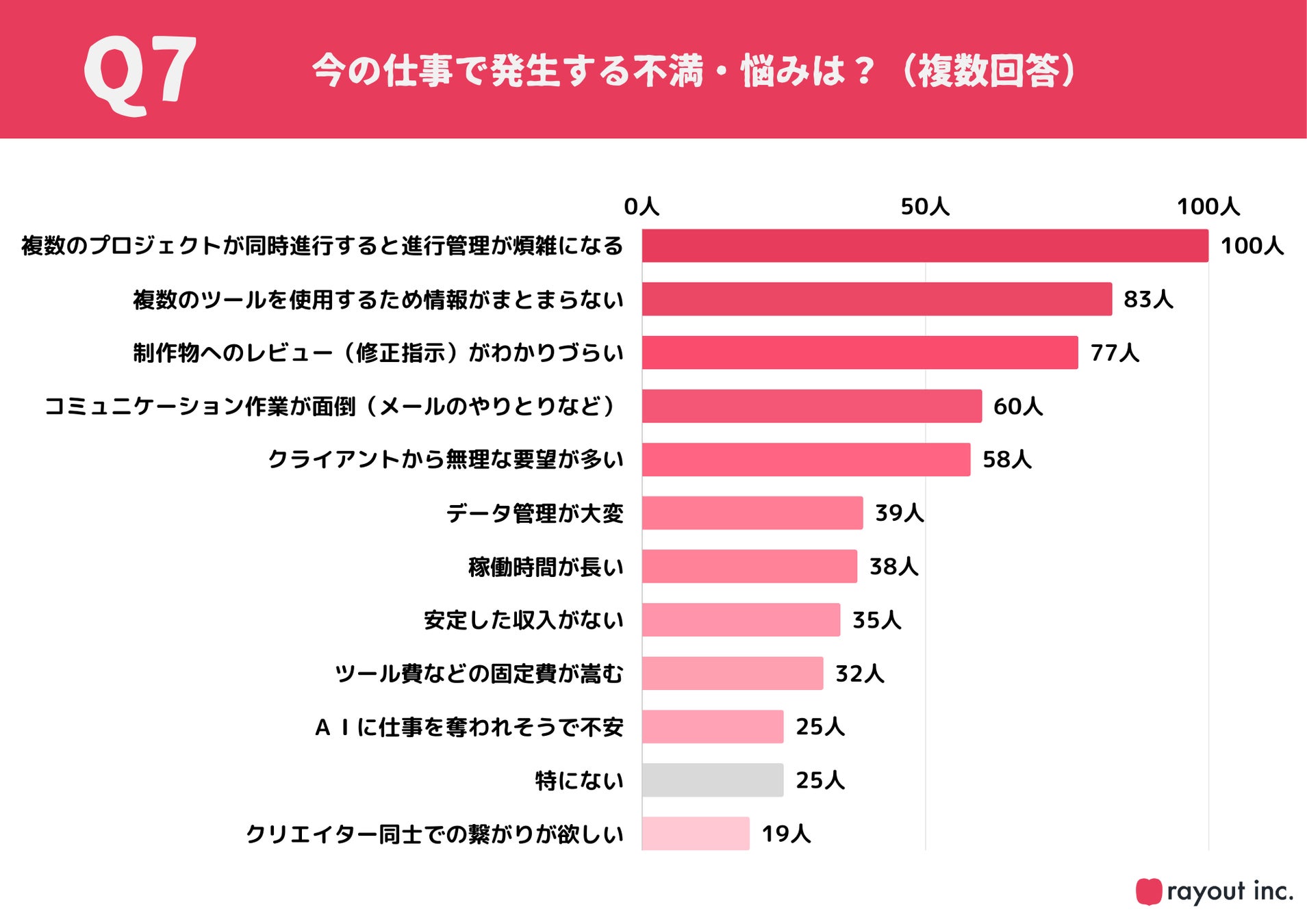 仕事をする上での不満・悩みに関する質問では(Q7)、「複数のプロジェクトを同時進行すると進行管理が煩雑になる」「複数のツールを使用するため情報がまとまらない」「制作物へのレビュー(修正指示)がわかりづらい」が上位3つとなり、収入や稼働時間への不満を大きく上回りました。