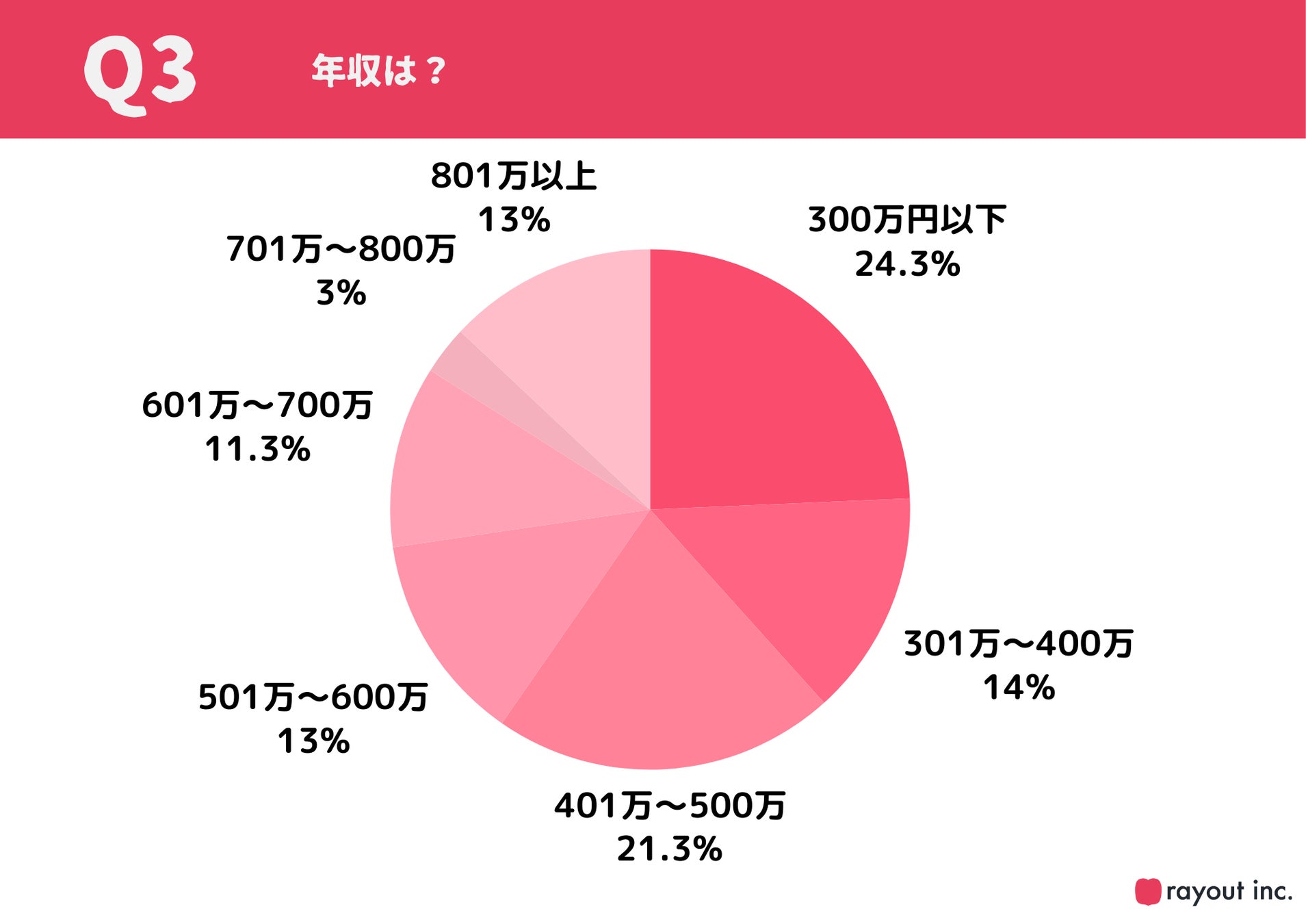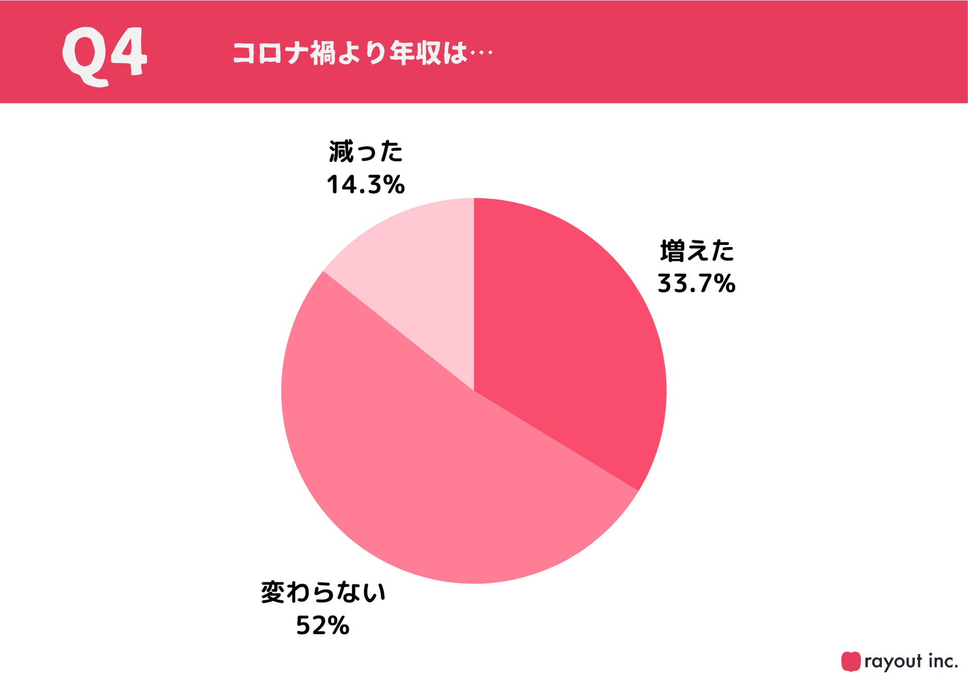現状の年収と、コロナ禍と比較した年収の増減を質問しました。(Q3・Q4)副業層が多いことも影響してか、年収400万円以下が3分の1以上を占めました。また、コロナ禍と比較し年収が「増えた」と答えた人が33.7%と減った人より多いものの、「変わらない」が52%と半数を上回る結果となりました。