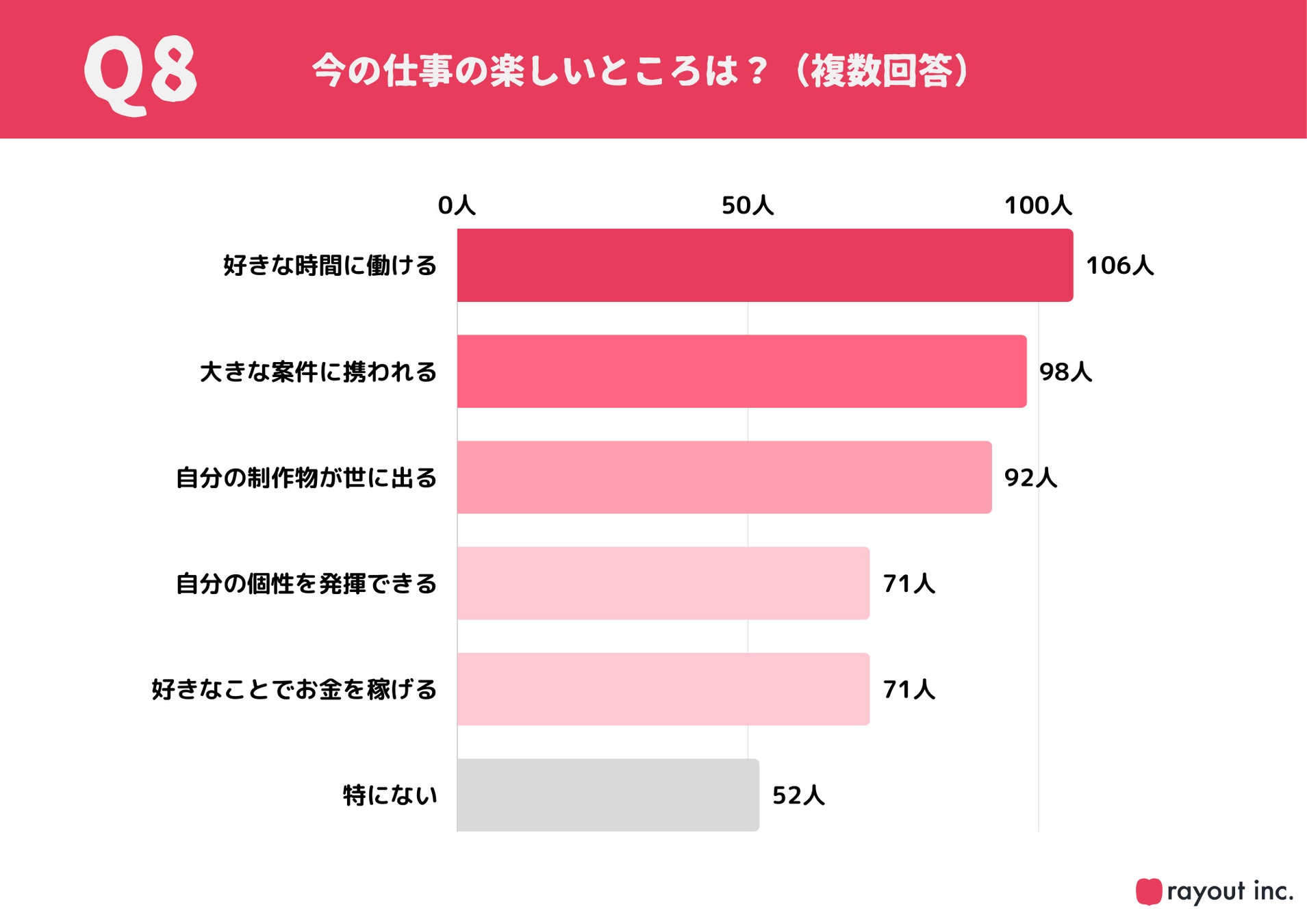 仕事の楽しいところについての質問は(Q8)、「好きな時間に働ける」「大きな案件に携われる」「自分の制作物が世に出る」が上位3つとなりました。